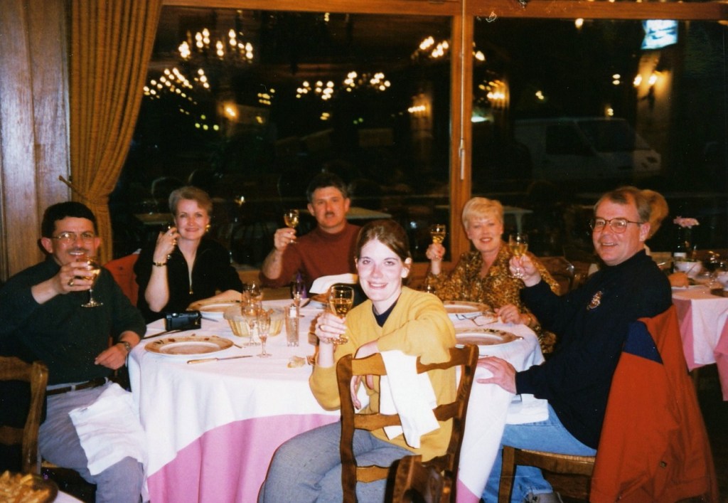 We dined under the tutelage of our hostess, the divine Madame Jeannette (center, standing). She was a hoot. This may have been the day Carine arrived (thus, in Chatel), or it may have been in La Chapelle-d’Abondance. The same may be said of the following photo. Both are dated April 9, 1997, which seems odd since they are obviously two separate venues. BTW, as I recall Carine (on Madame Jeannette’s right) arrived from Paris to be an au pair for Walter’s (on the left) and Michelle’s (taking the picture) children while we vacationed in Chatel, France . . .