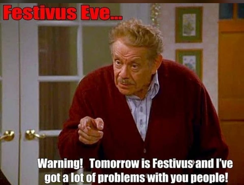 Welcome, newcomers. The tradition of Festivus begins with the airing of grievances. I got a lot of problems with you people and now you’re gonna hear about it. ~ Frank Costanza