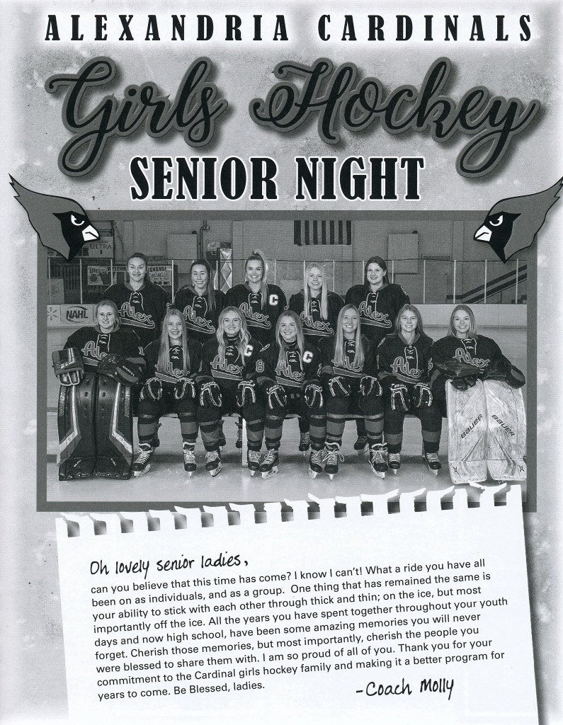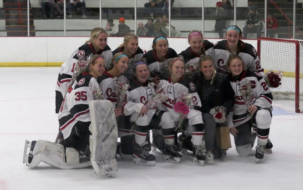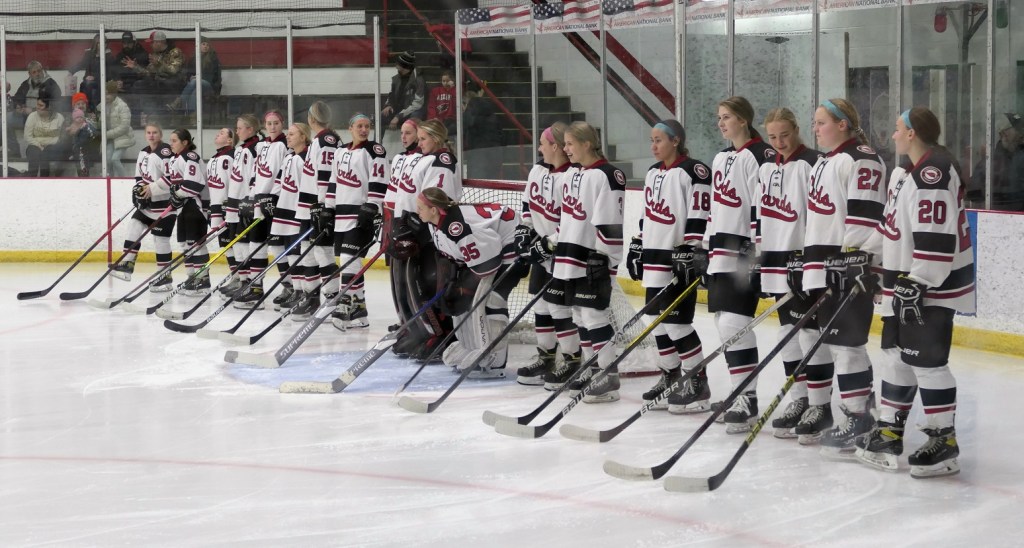 [Senior goalies Jordan O’Kane (1) and Hailey Bailey (35) split time in the goal on this game. They apparently are best buddies and have been alternating most of the season . . . ]