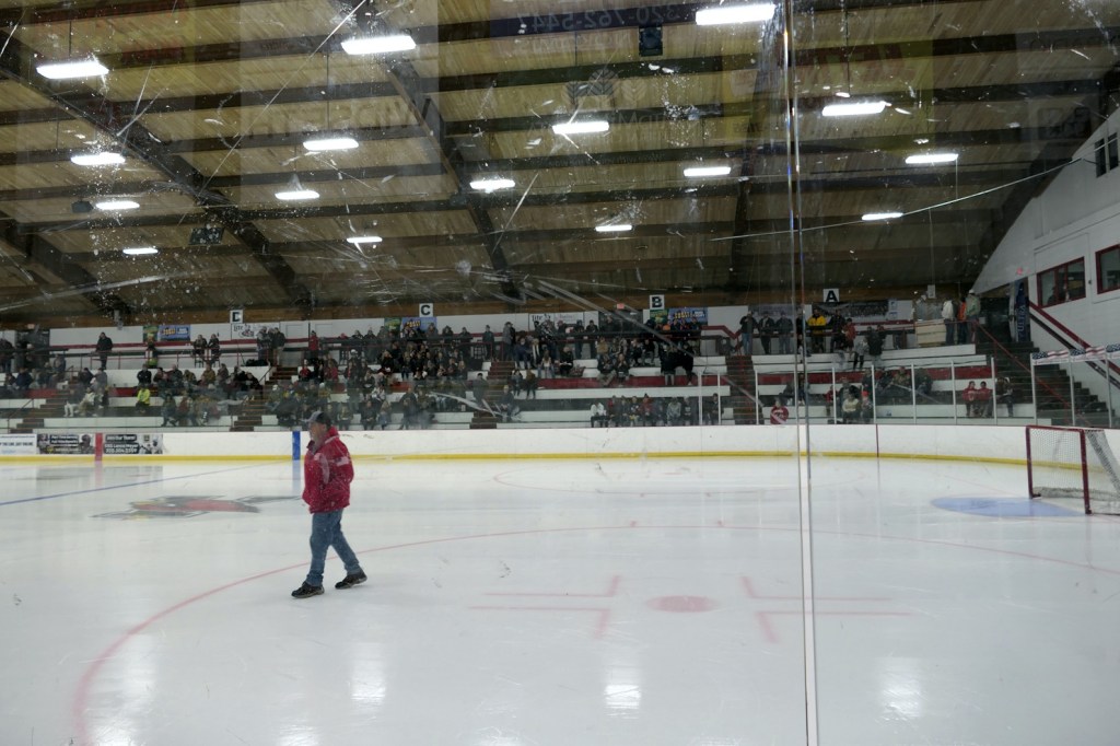 [You will likely note that I’m shooting through the glass at an angle. And from this angle you can see every mark on the glass caused by collisions with players, sticks, and pucks . . . ]