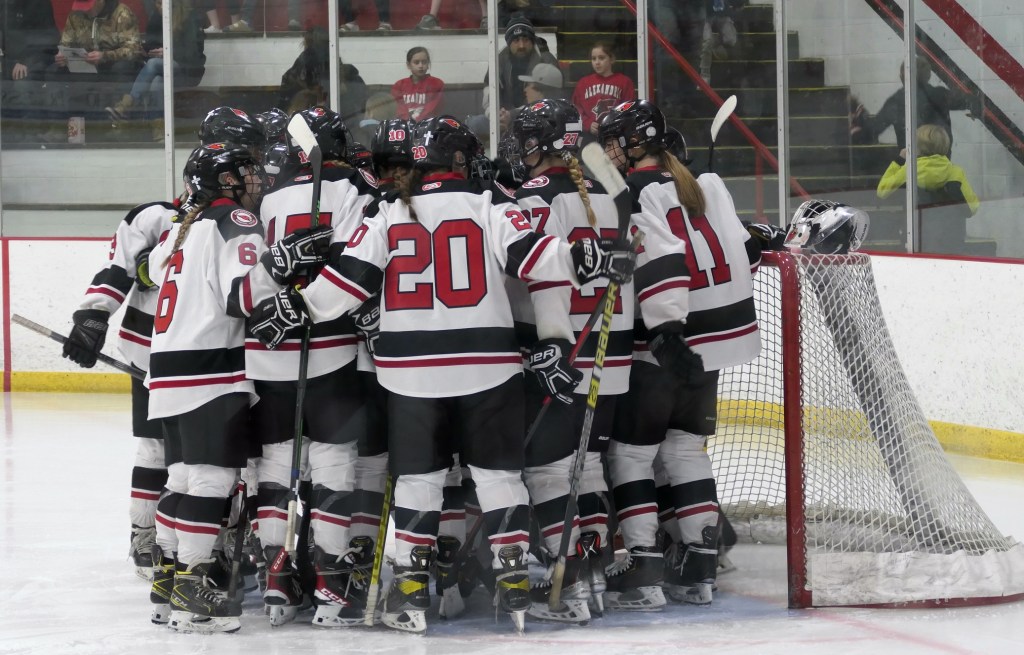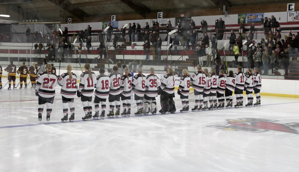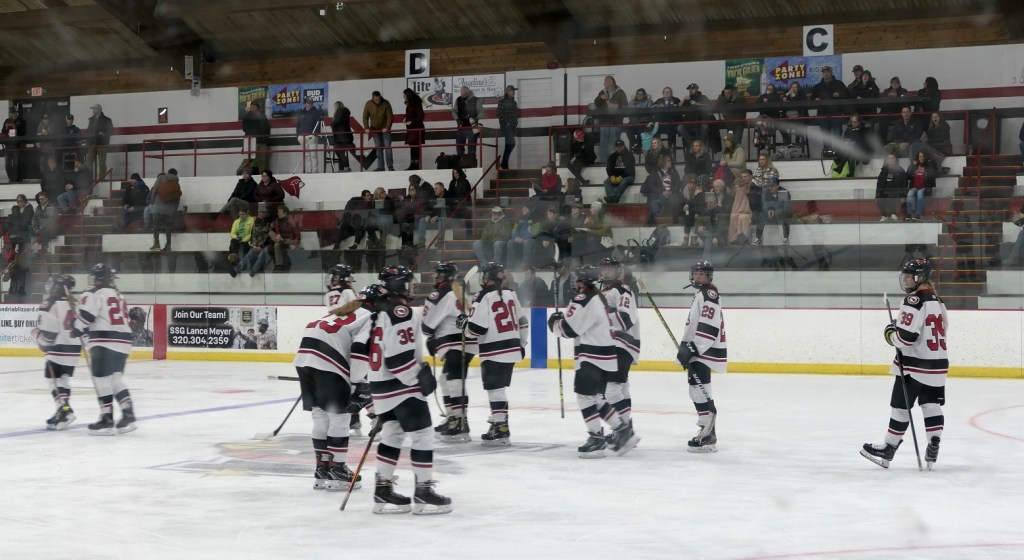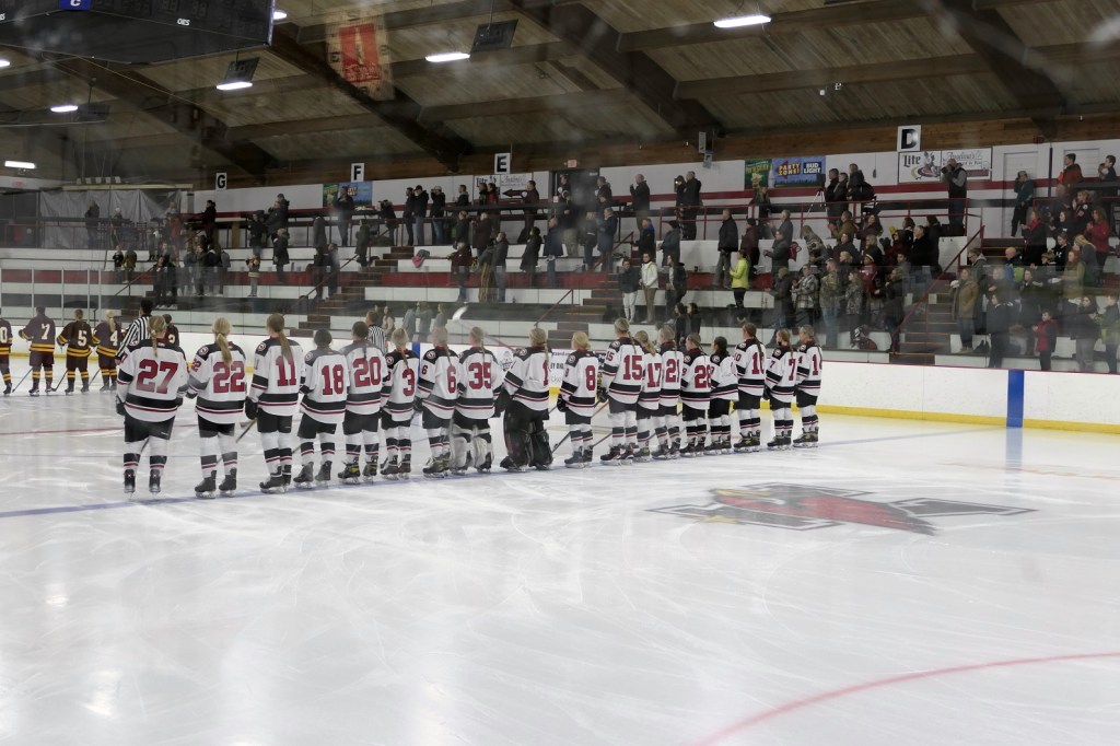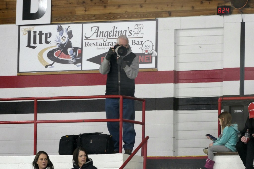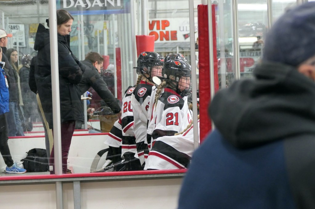 [And the hockey moms joined in. The player in civvies is a team captain, Kaci Trosvig, who is out with injury (shoulder, I believe) . . . ]