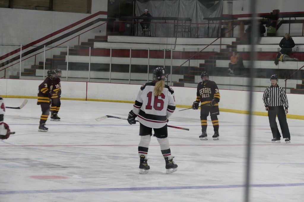 [The Cards were hosting our long time conference rival Fergus Falls. I arrive in time to see about half of the JV games, to see the up and comers. This was just after a goal by sophomore defense Maya Wagner (16). I thought she was very impressive – good size, good skater, good stick handler. I’m kind of surprised she’s not playing on the varsity yet . . . ]