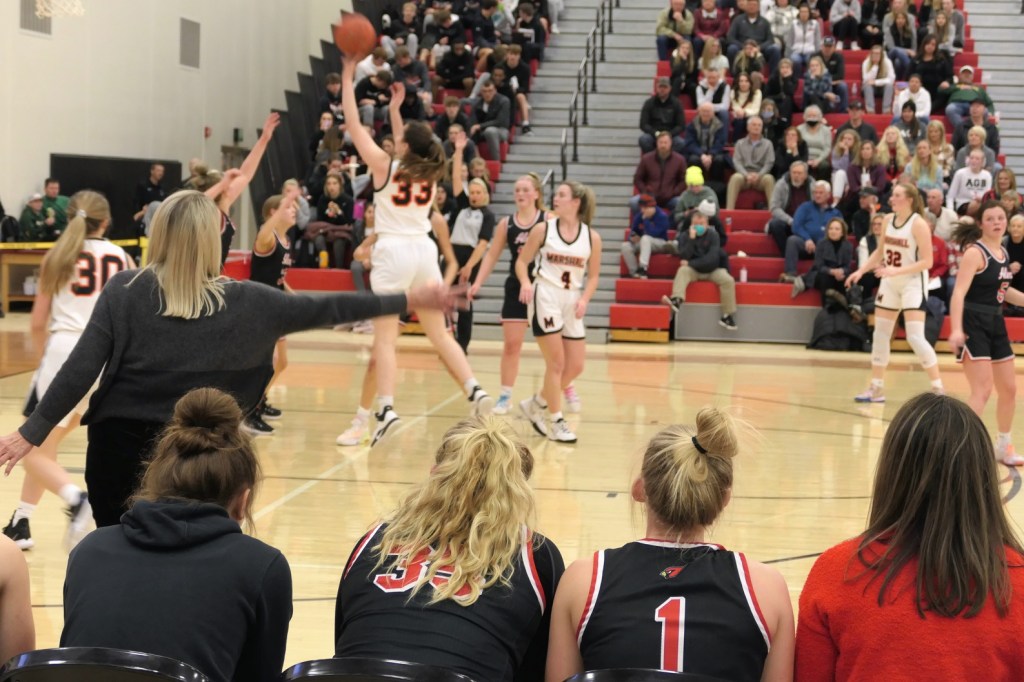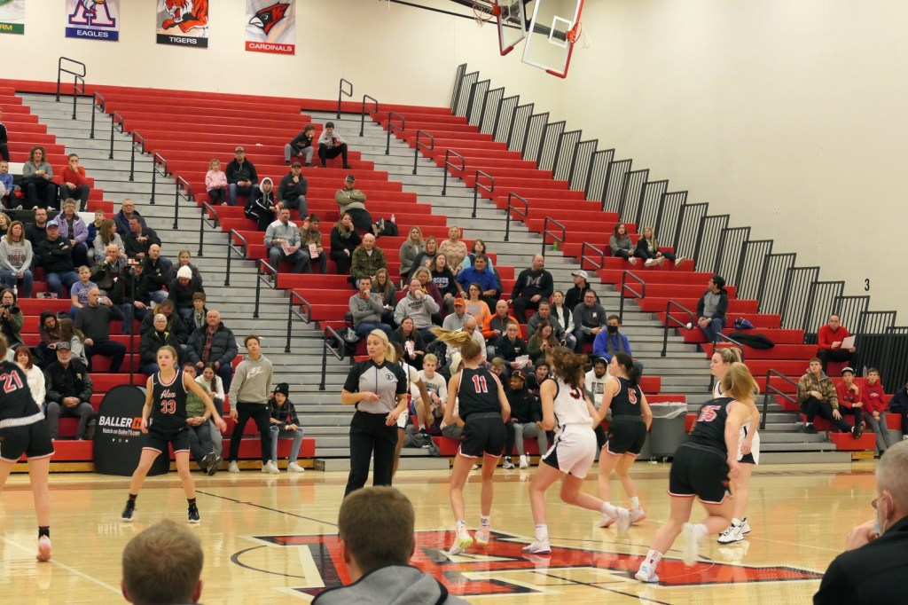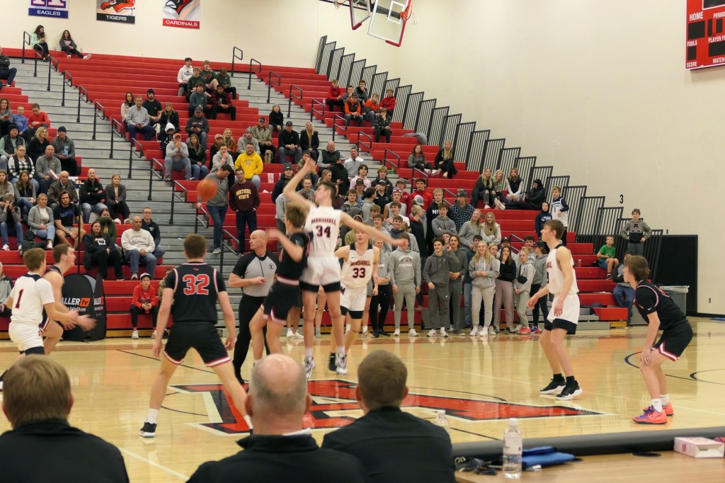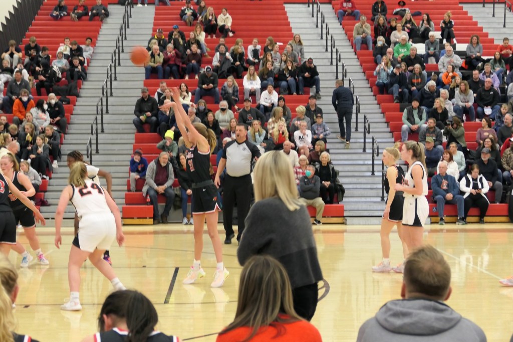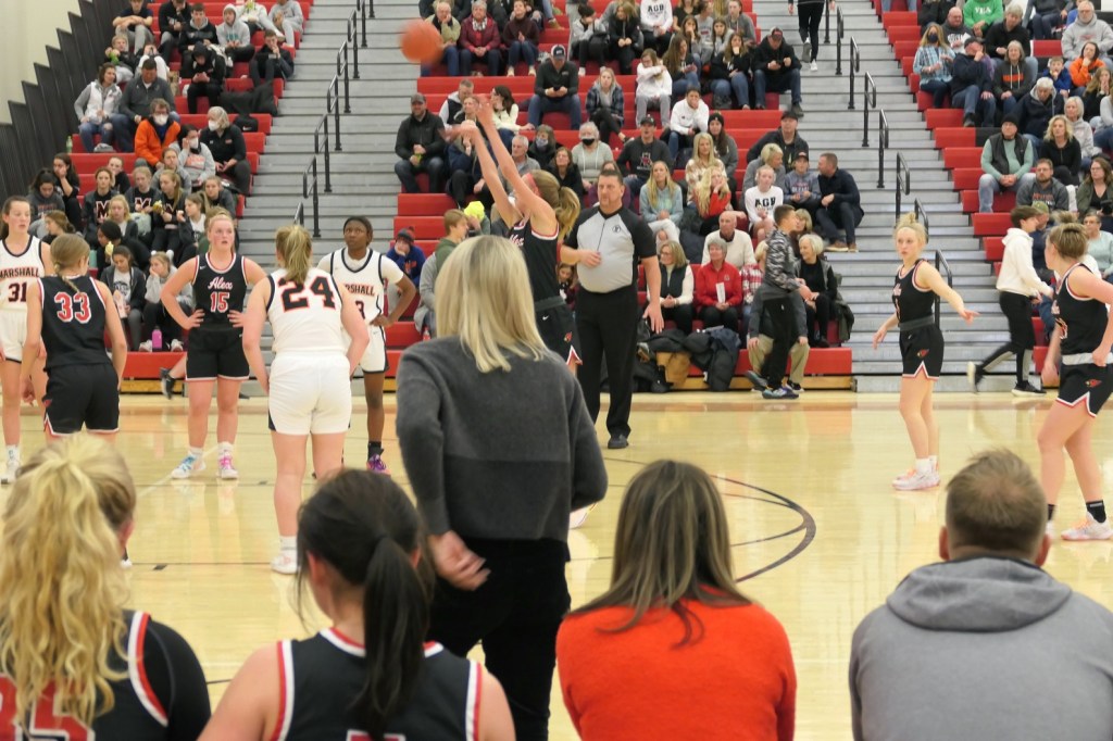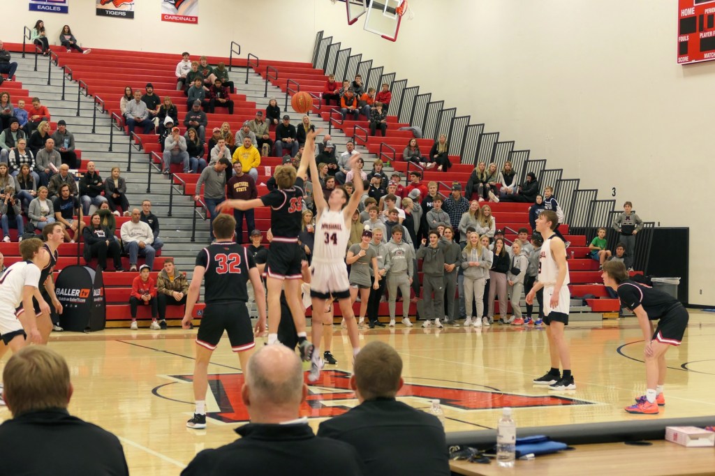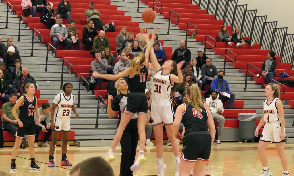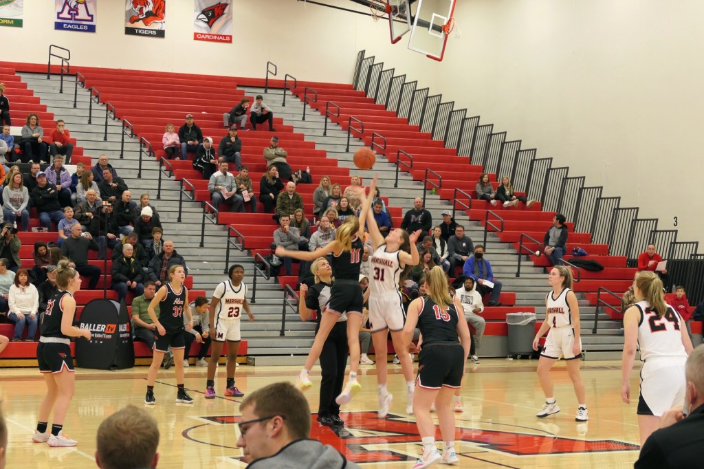 [The Cardinals played the Marshall Tigers in both games. Here’s the tipoff of the girls game (obviously). Freshman Hadley Thul (11) jumped for the Cards, aided and abetted by fellow freshmen Allie Haabala (33) and Chloe Scholl (15). The Cards start four freshmen, with MaCee Linow (21), against a ranked Marshall team that is undefeated in its conference . . . ]