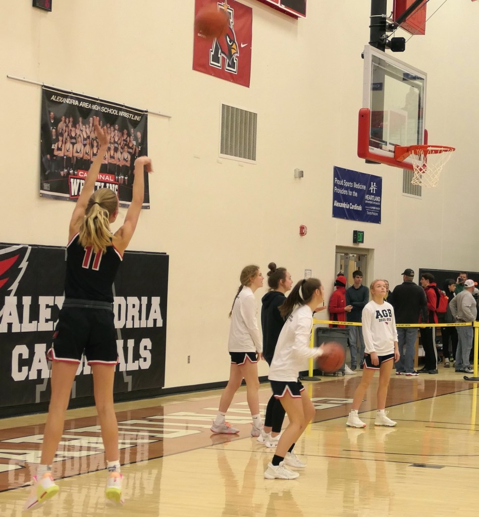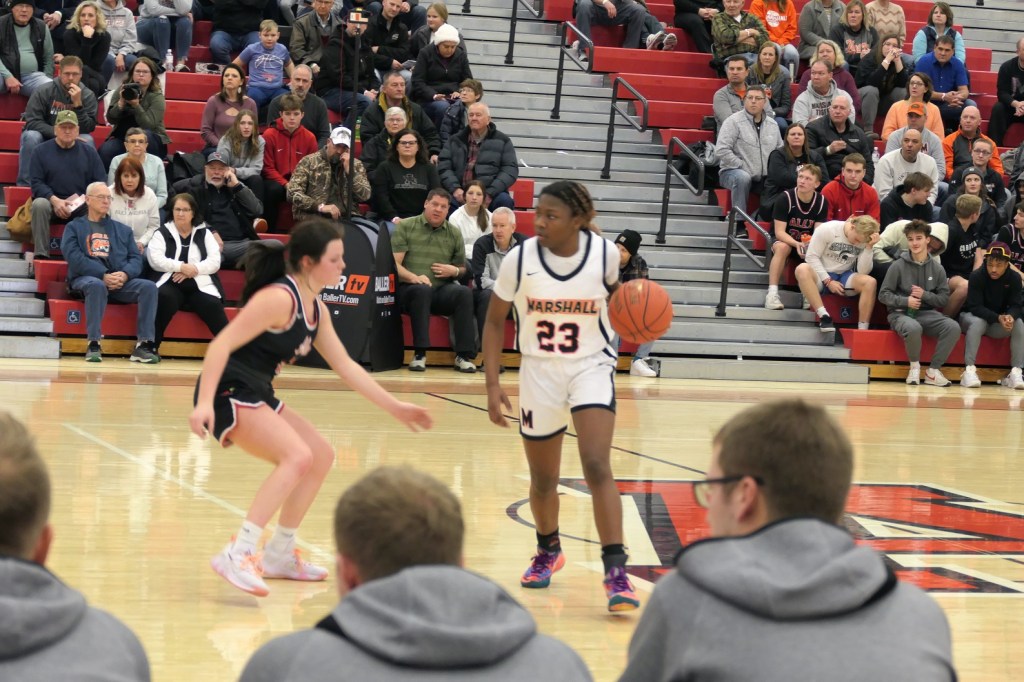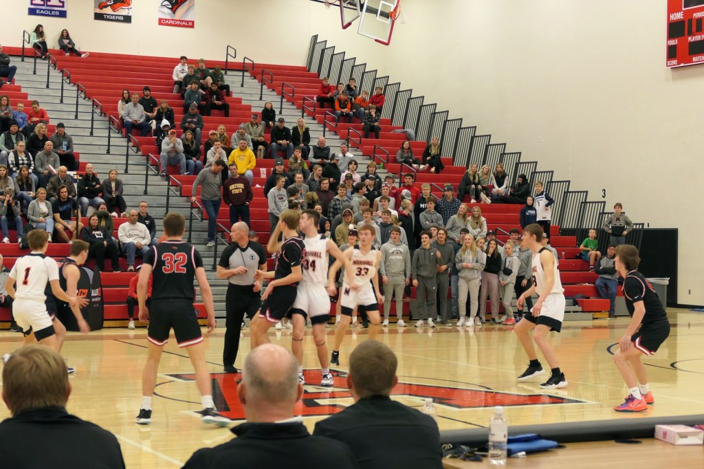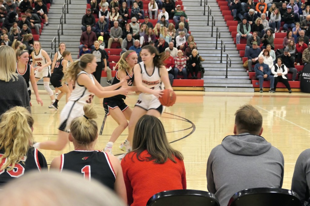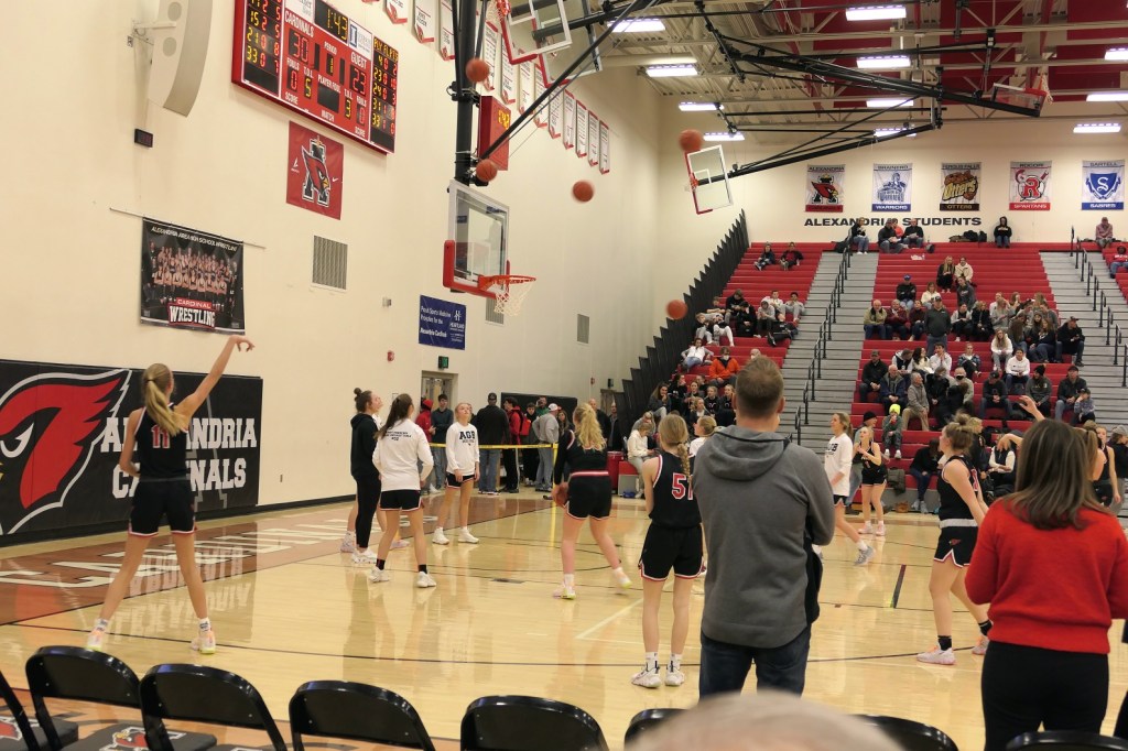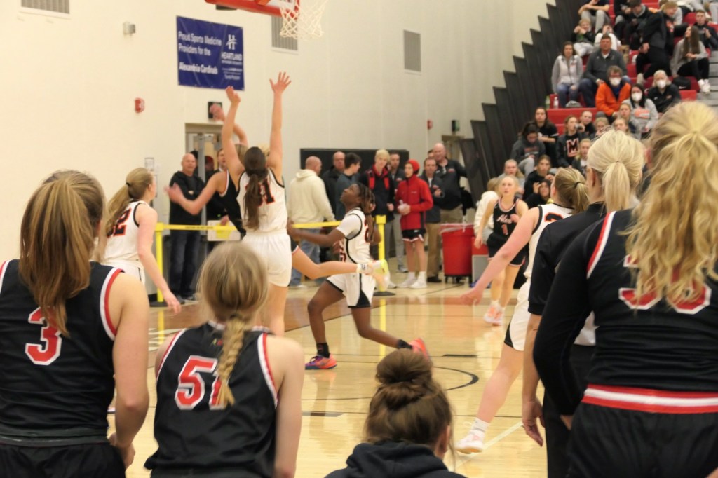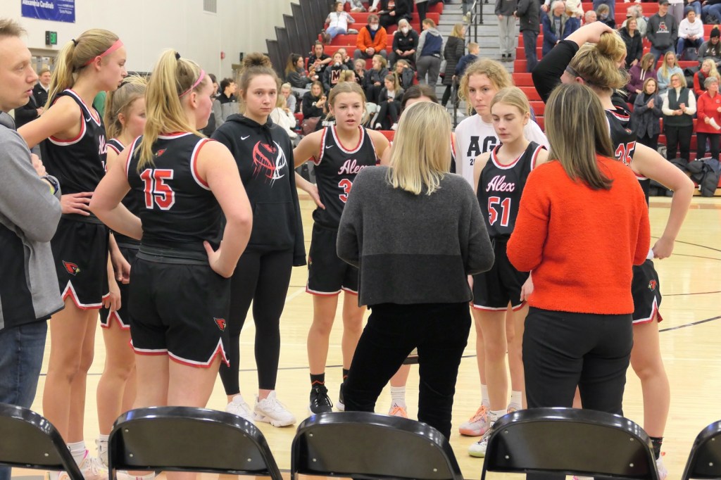 [The Cardinals played the Marshall Tigers in both games. Here’s the tipoff of the girls game (obviously). Freshman Hadley Thul (11) jumped for the Cards, aided and abetted by fellow freshmen Allie Haabala (33) and Chloe Scholl (15). The Cards start four freshmen, with MaCee Linow (21), against a ranked Marshall team that is undefeated in its conference . . . ]