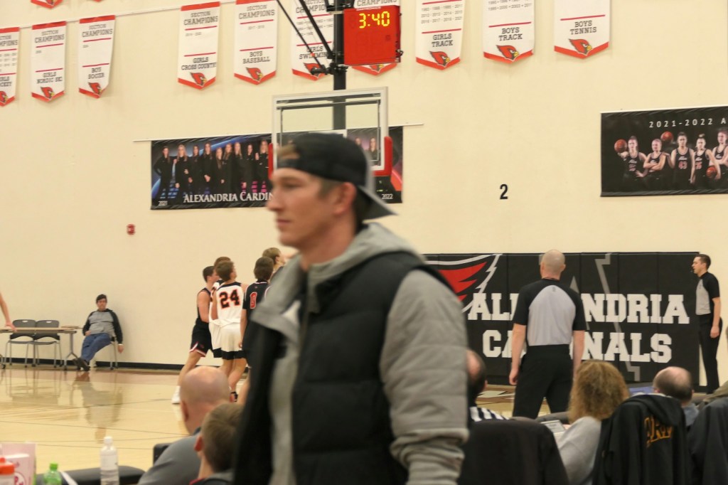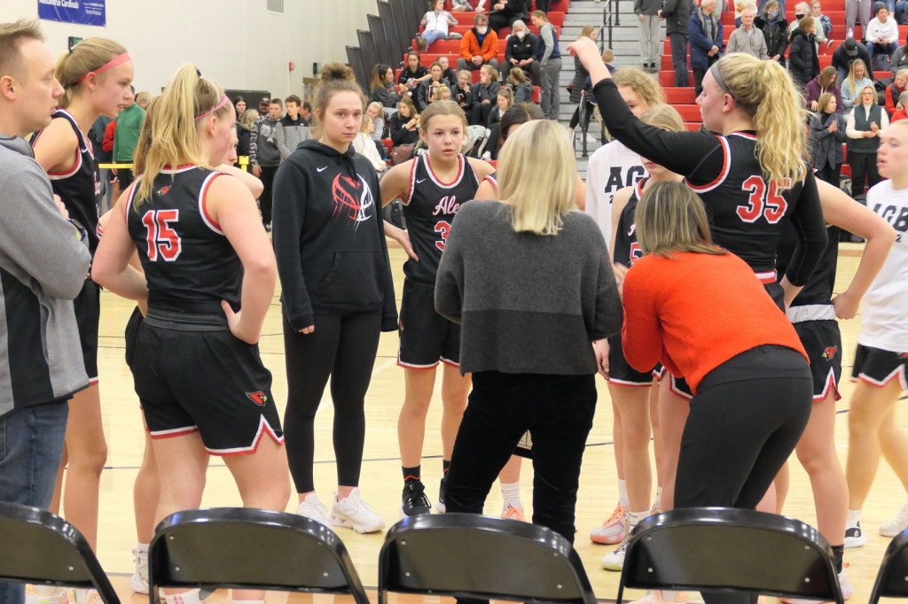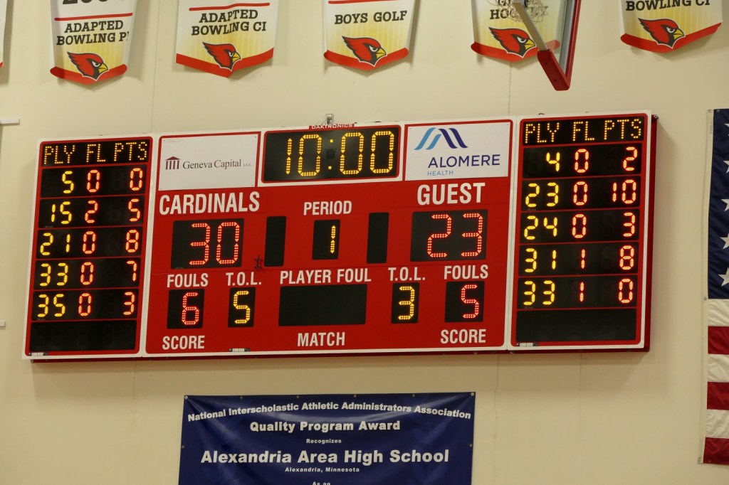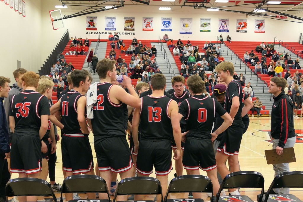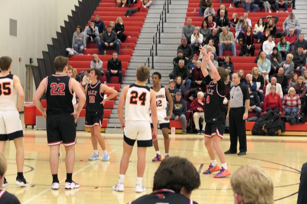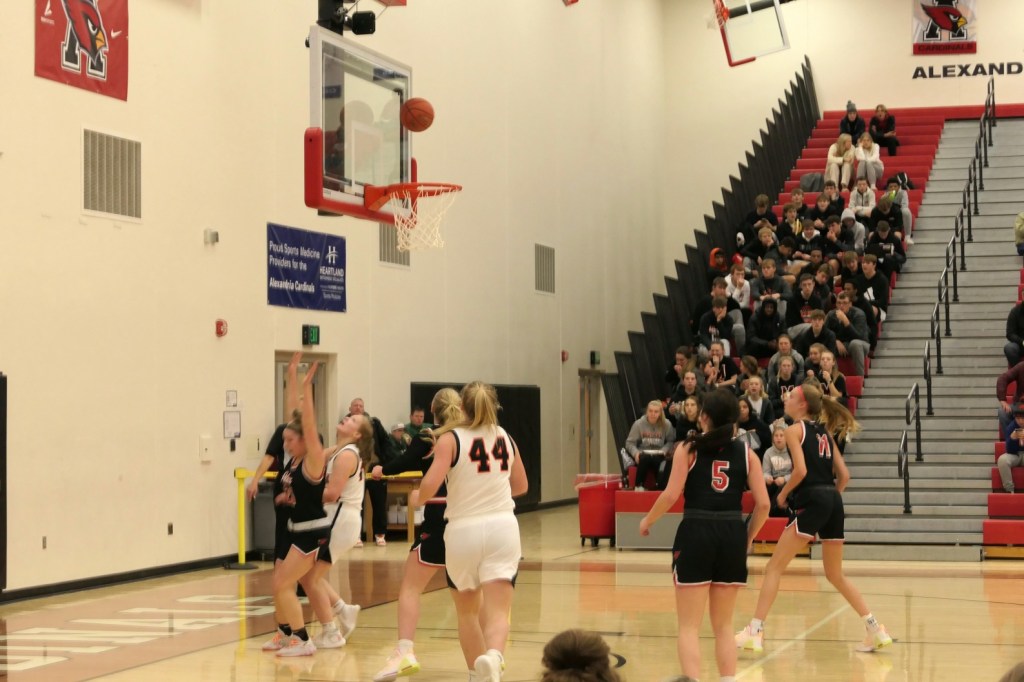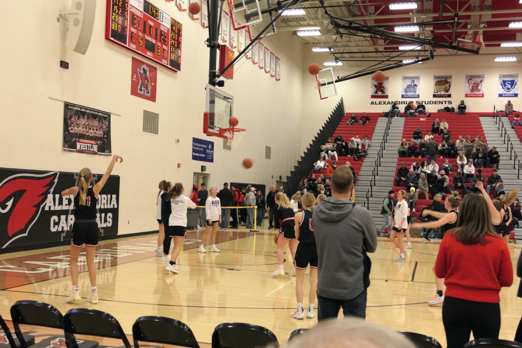[The Cardinals played the Marshall Tigers in both games. Here’s the tipoff of the girls game (obviously). Freshman Hadley Thul (11) jumped for the Cards, aided and abetted by fellow freshmen Allie Haabala (33) and Chloe Scholl (15). The Cards start four freshmen, with MaCee Linow (21), against a ranked Marshall team that is undefeated in its conference . . . ]