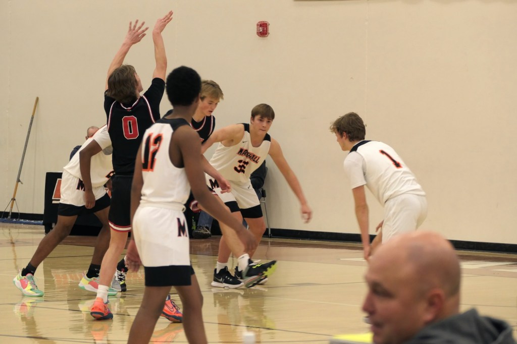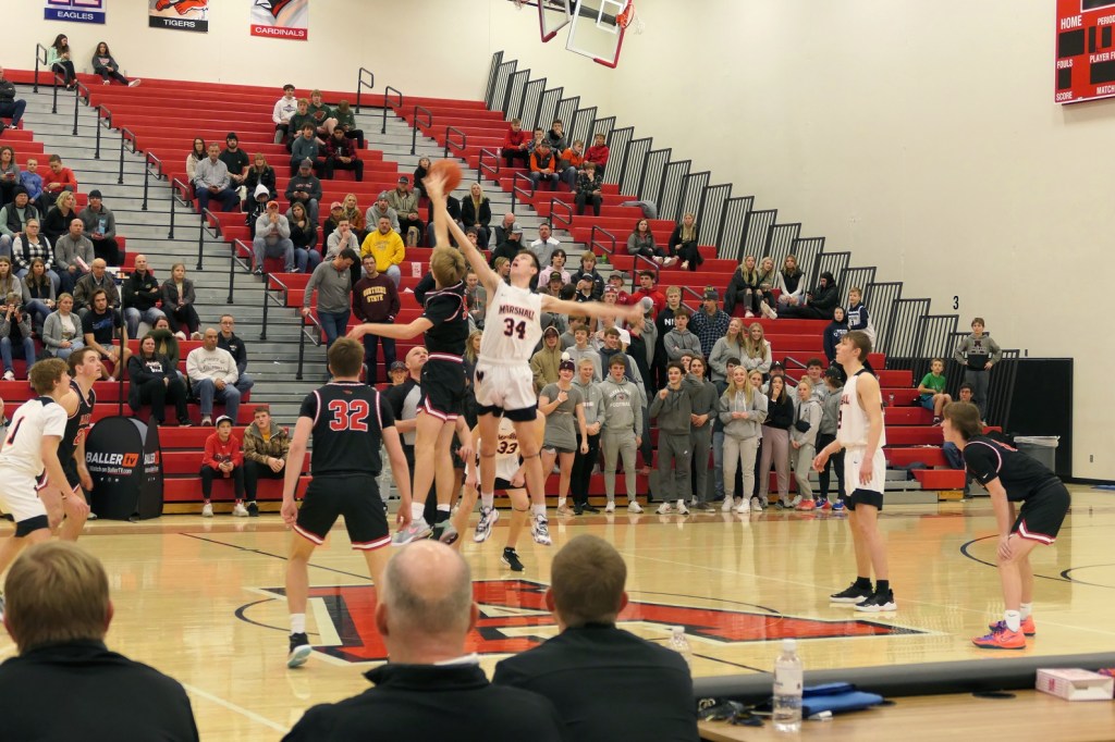 [The Cards 6’8″ sophomore center Grayson Grove wins another tipoff. But I have to say Marshall was more than impressive during warm-ups. They have a 6’9″ player and it seemed about 6 other players over 6’5″?]