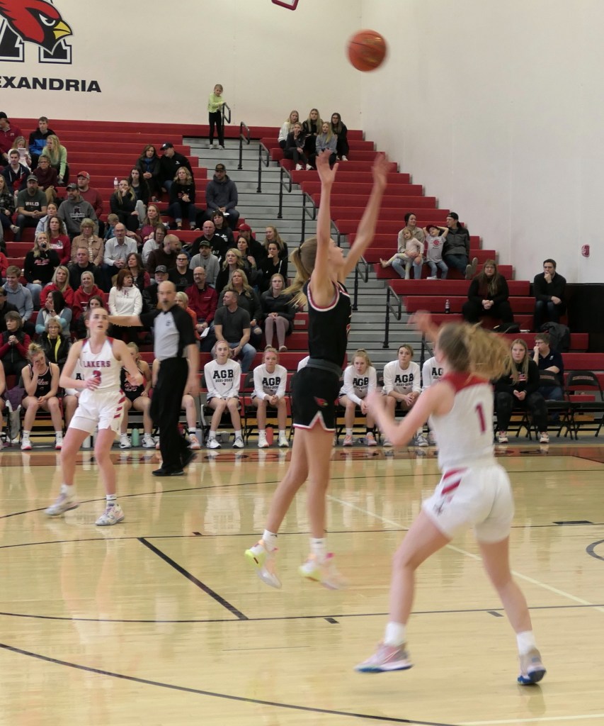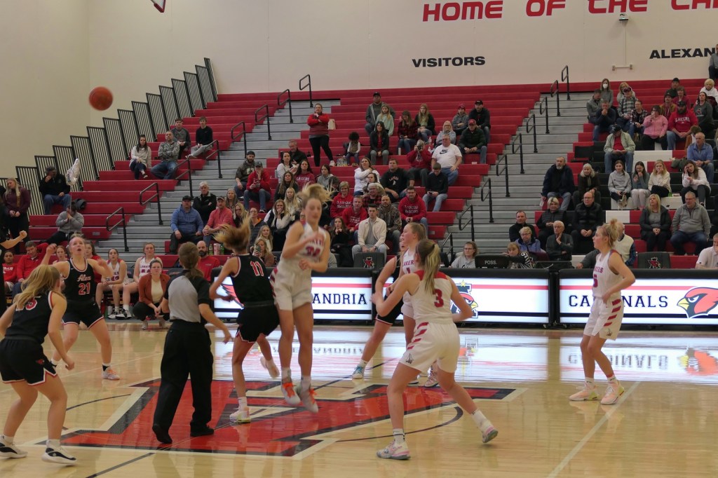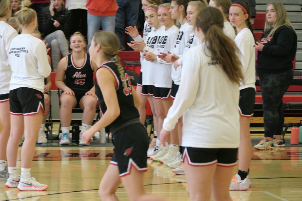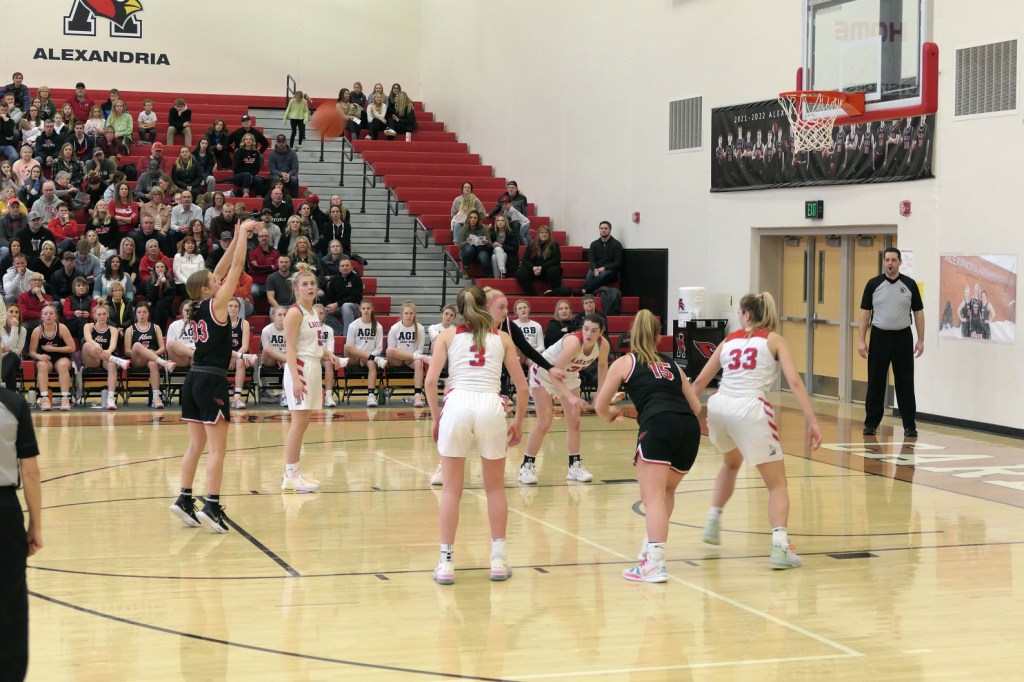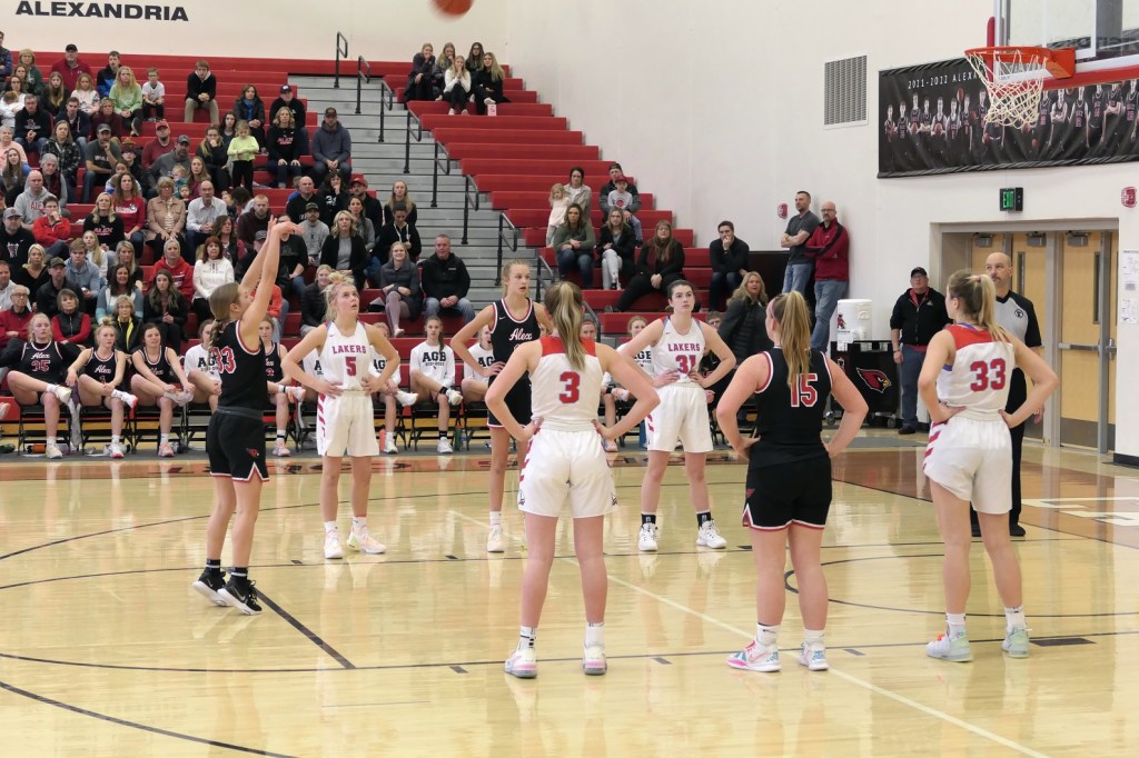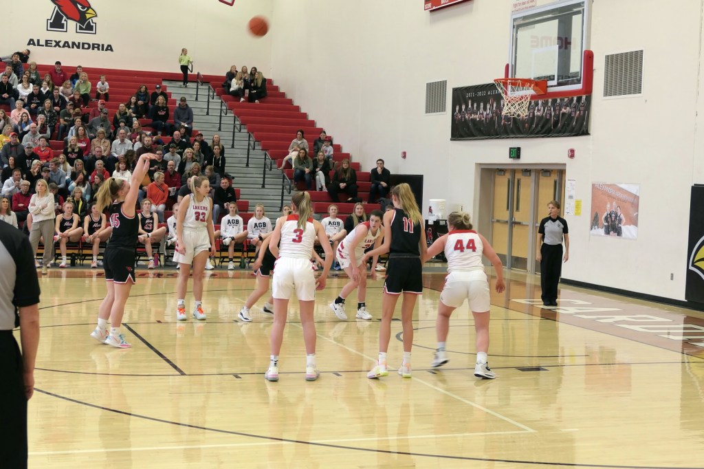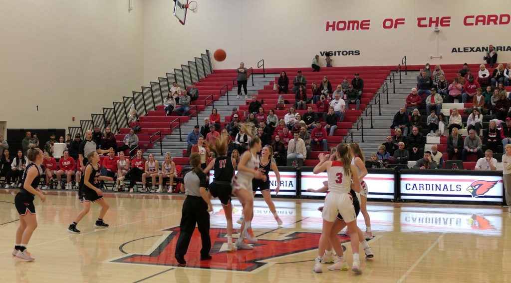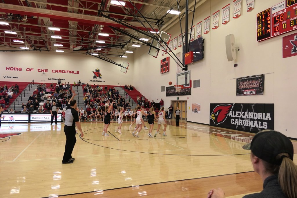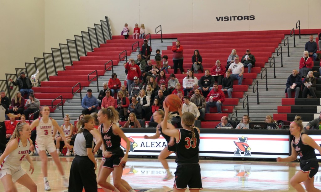 [The boys team had a game at Fergus Falls earlier in the afternoon. They won to tie for the conference title. Then they dropped by as fan support for the girls. Sometimes it just doesn’t work out . . . ]