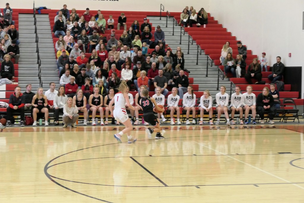 [The game within the game: DL’s point guard junior Abby Larson (1) versus Allie, the Cardinal point guard . . . ]