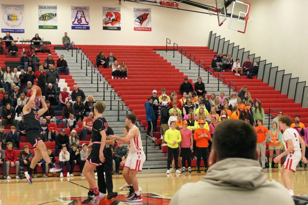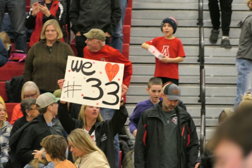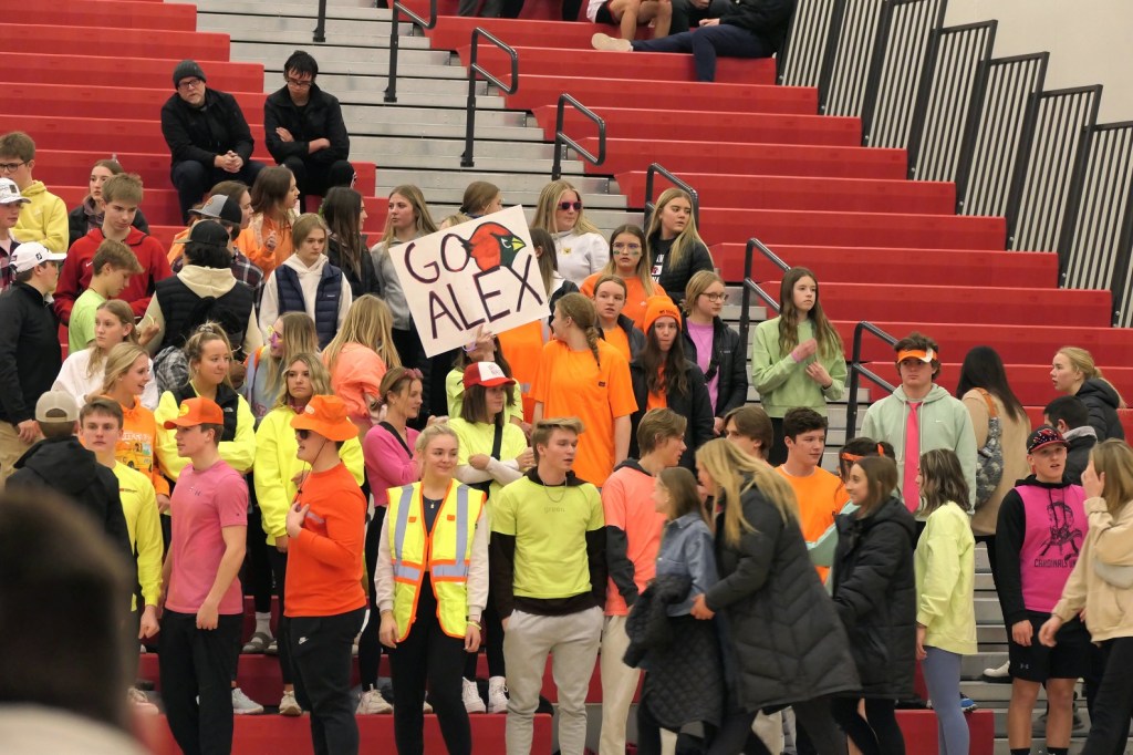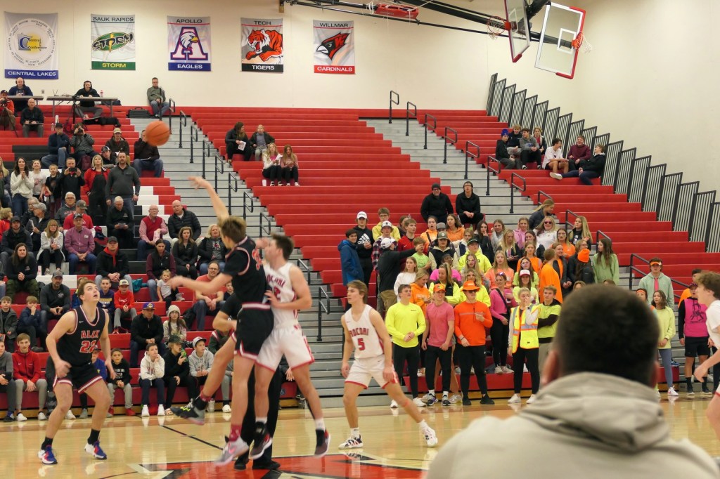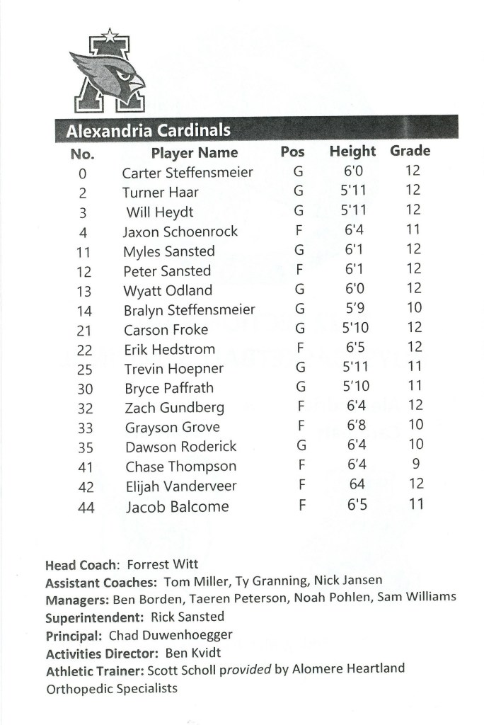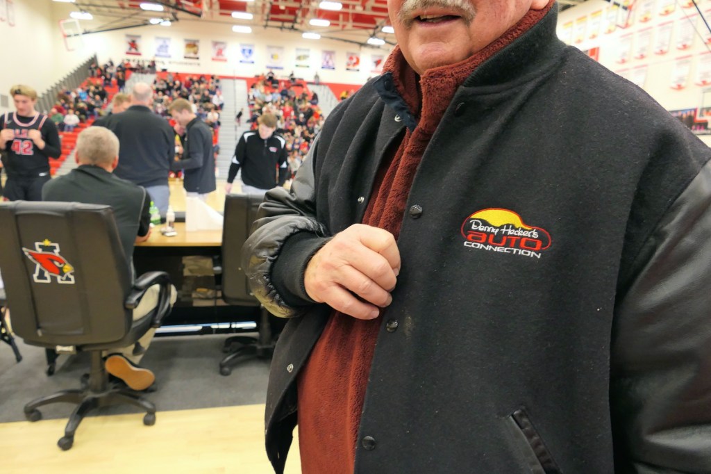 [Blasts from the past: The fellow in the Alaska cap and black shirt is Chuck Betterman (Alex class of ’63), who the Fat Boys see every morning at the Y. His granddaugher, Karly, was one of my all-timers, playing in the 2013 era. Sitting in front of Chuck is Ella Grove, a star player for Alex who graduated two years ago. Yup, the older sister of Grayson . . . ]