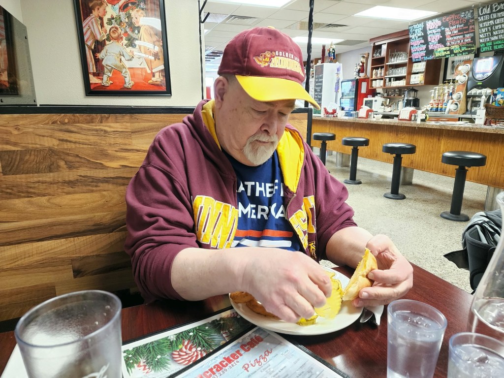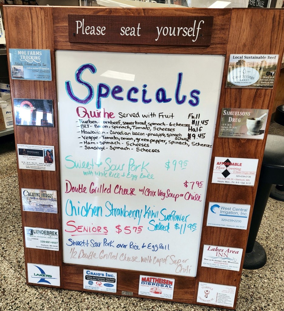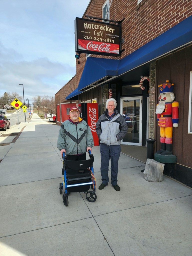 [A beef commercial at Nutcrakers Cafe in downtown Starbuck (population 300). Starbuck is on the western edge of Lake Minnewaska, a little over 7 miles from Glenwood, which is on the eastern edge of Lake Minnewaska. A “commercial” is such a Minnesota established dining entree, there are statewide contests to see which restaurant makes the best. Of recent vintage, Mike Bump’s (resident in good standing of the Fat Boys Walking Club) restaurant, “Bump’s” (now run by his son-in-law) commercial in Glencoe has been rated #1 . . . ]