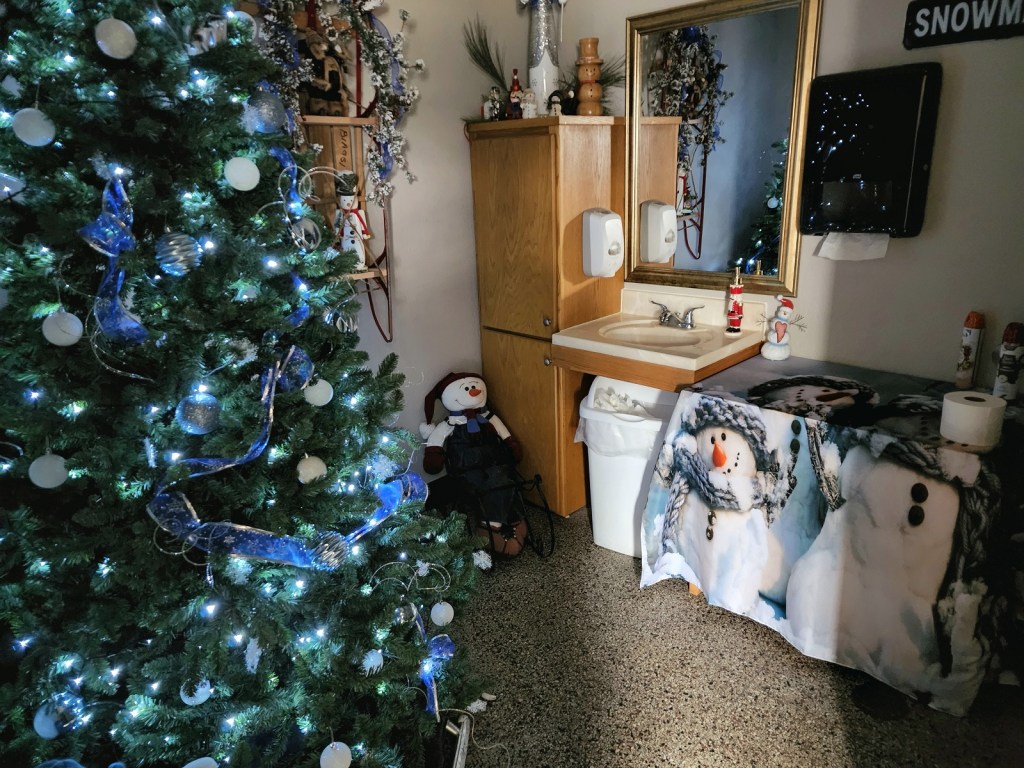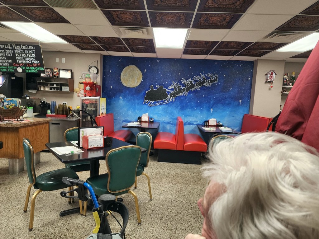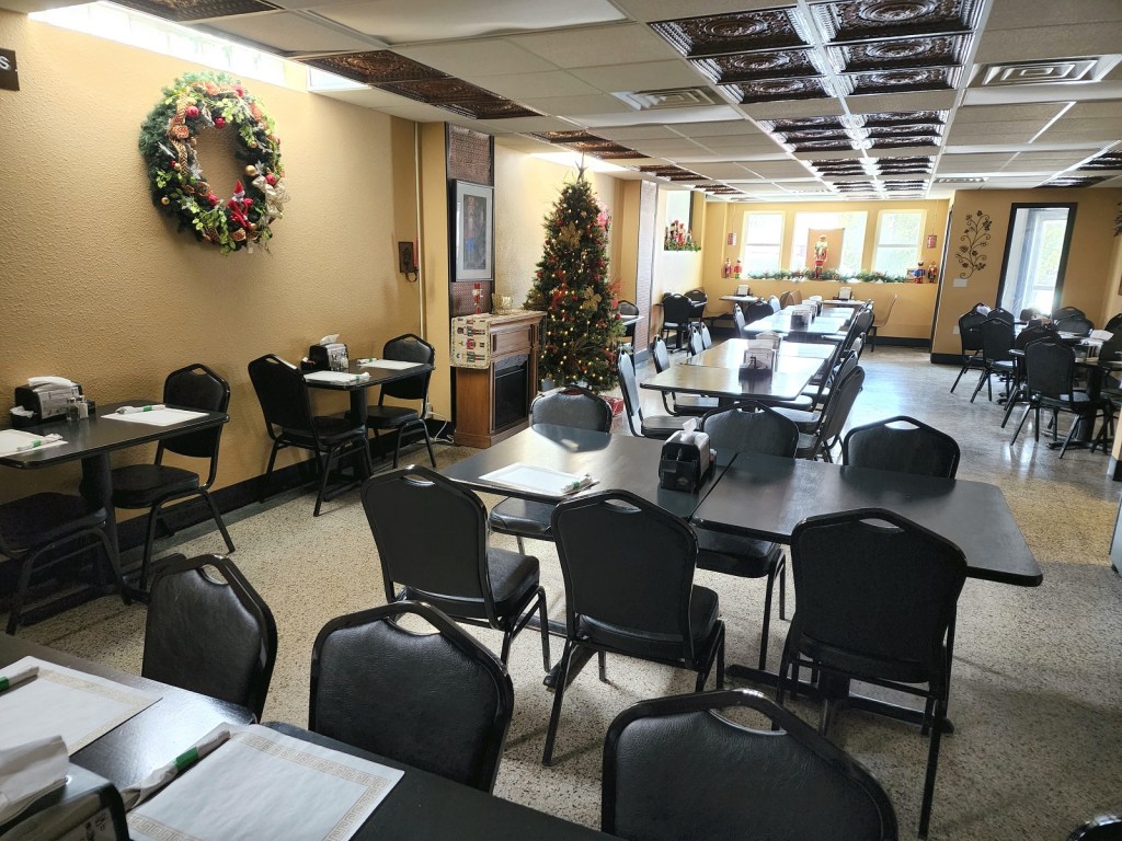 [The cafe had an adjoining banquet room as well – come help decorate the tree . . . ]