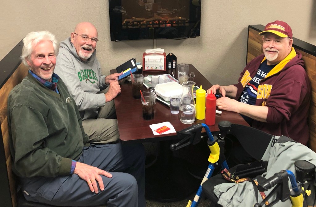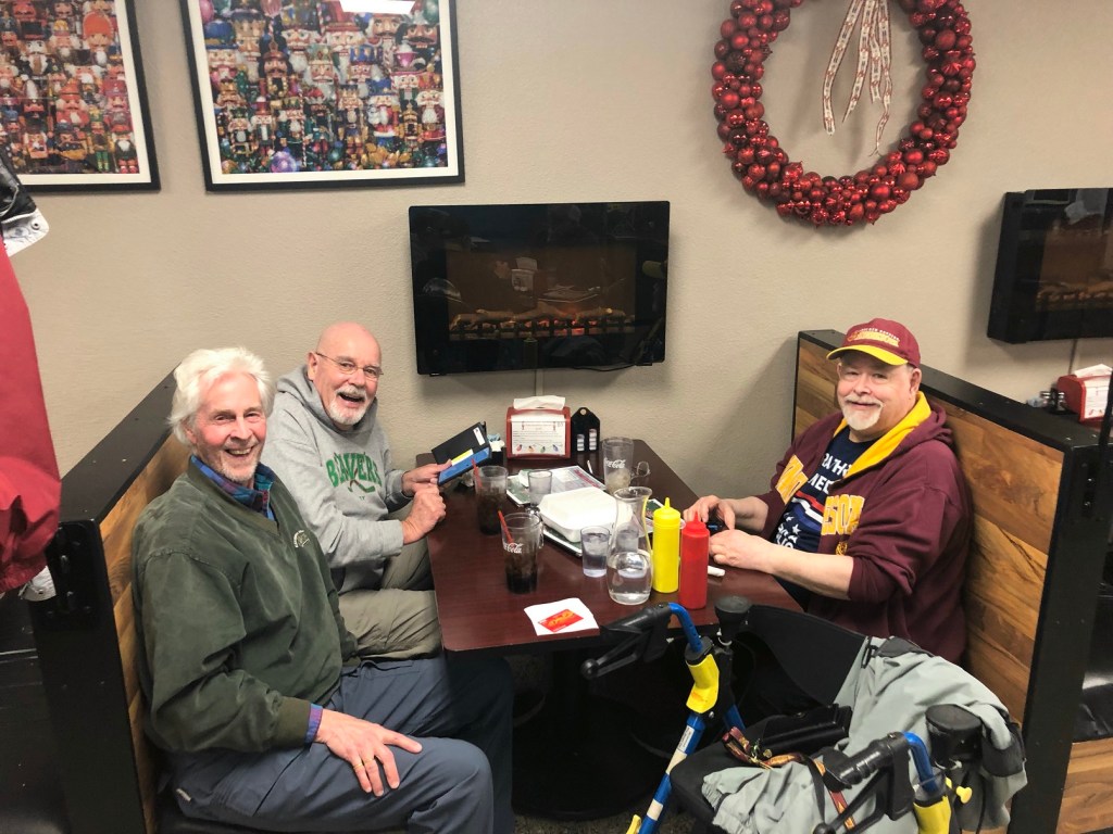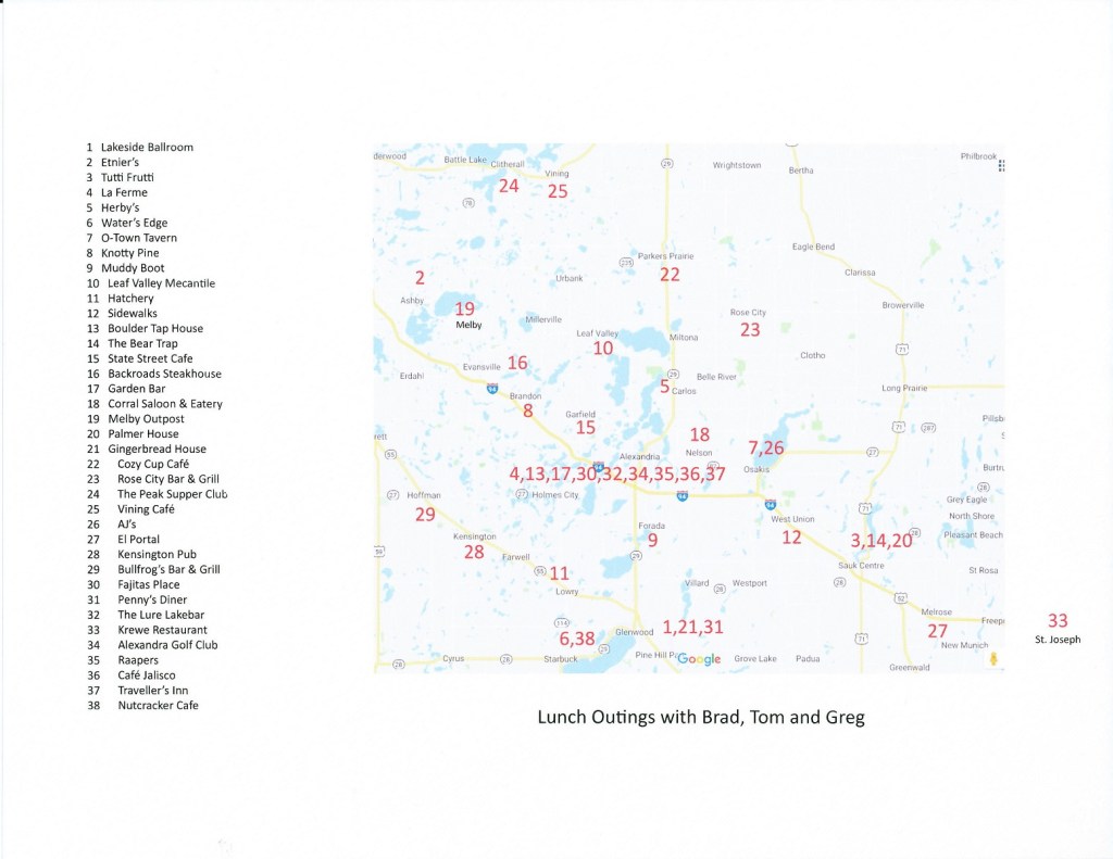 The many years of road trips with Greg (Mayo), Brad, & me, to include Professor Doctor Colonel Kiehne when he’s in town from Austin, Texas. The last couple years because of COVID and Brad’s health we have had to stick to local restaurants multiple times such as the Lure (6 times), the Alex golf club (4x), Traveller’s Inn, and Casa Jalisco . . .