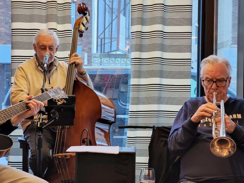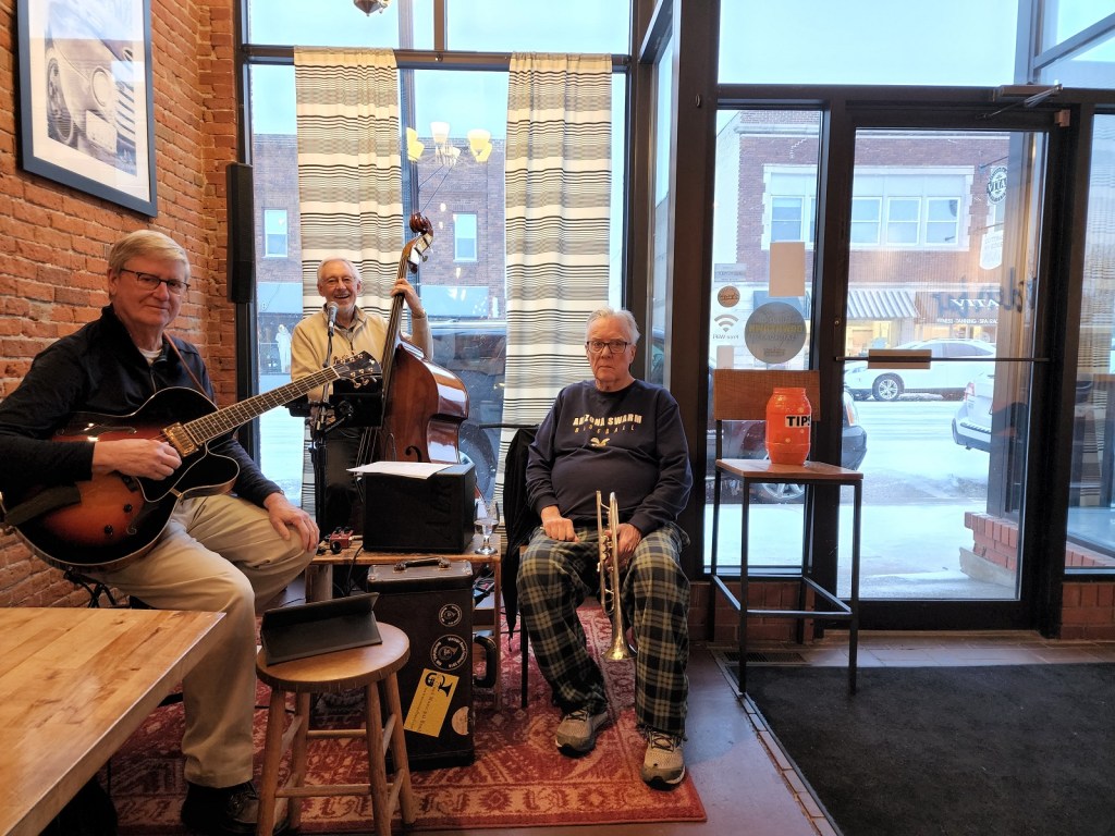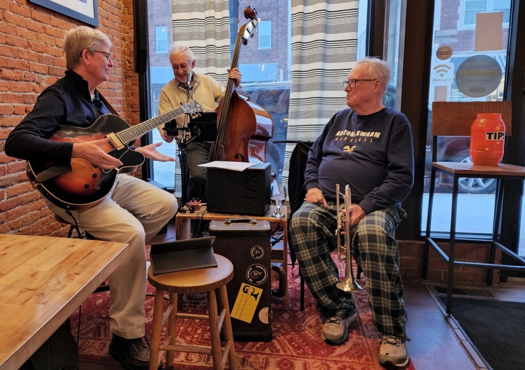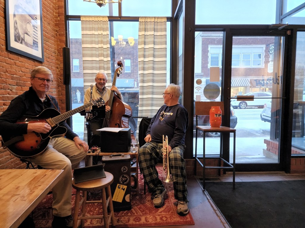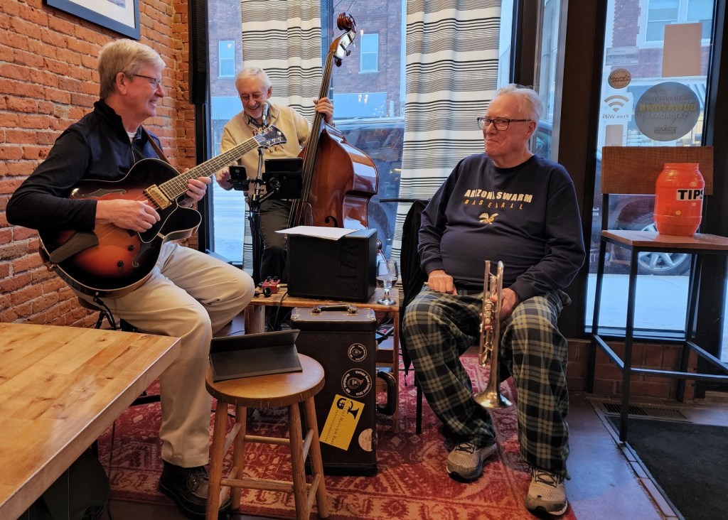 [Terry Kennedy – guitar; Jim Faber – bass & voice; Bill Riggs – trumpet; as a group, Tuesday Night Club. On this night, Al Lieffort – mandolin & voice, decided not to make his commute from Minneapolis because of the ongoing daily blizzard. The tip jar, in its luminescent orange color, adds to the overall ambience . . . ]