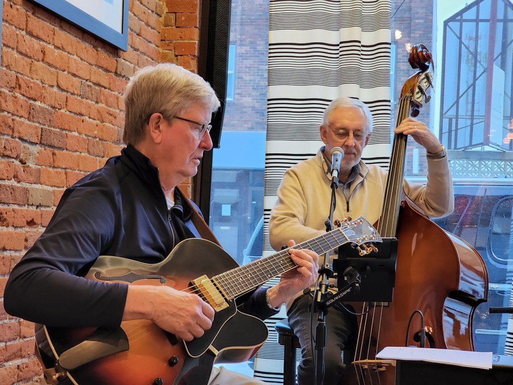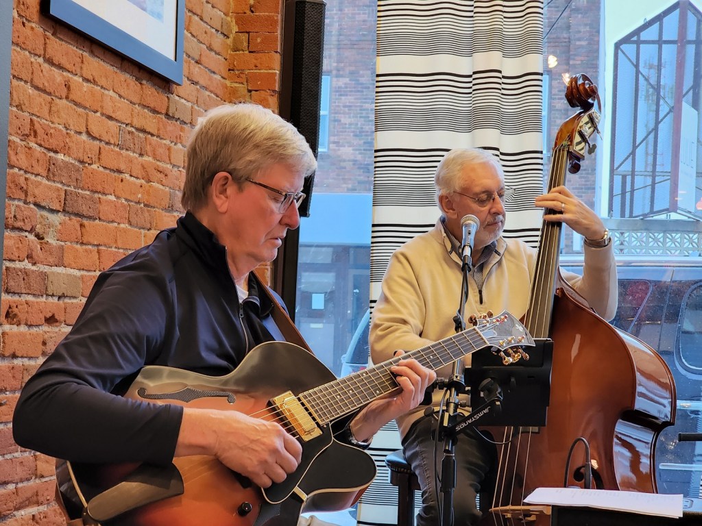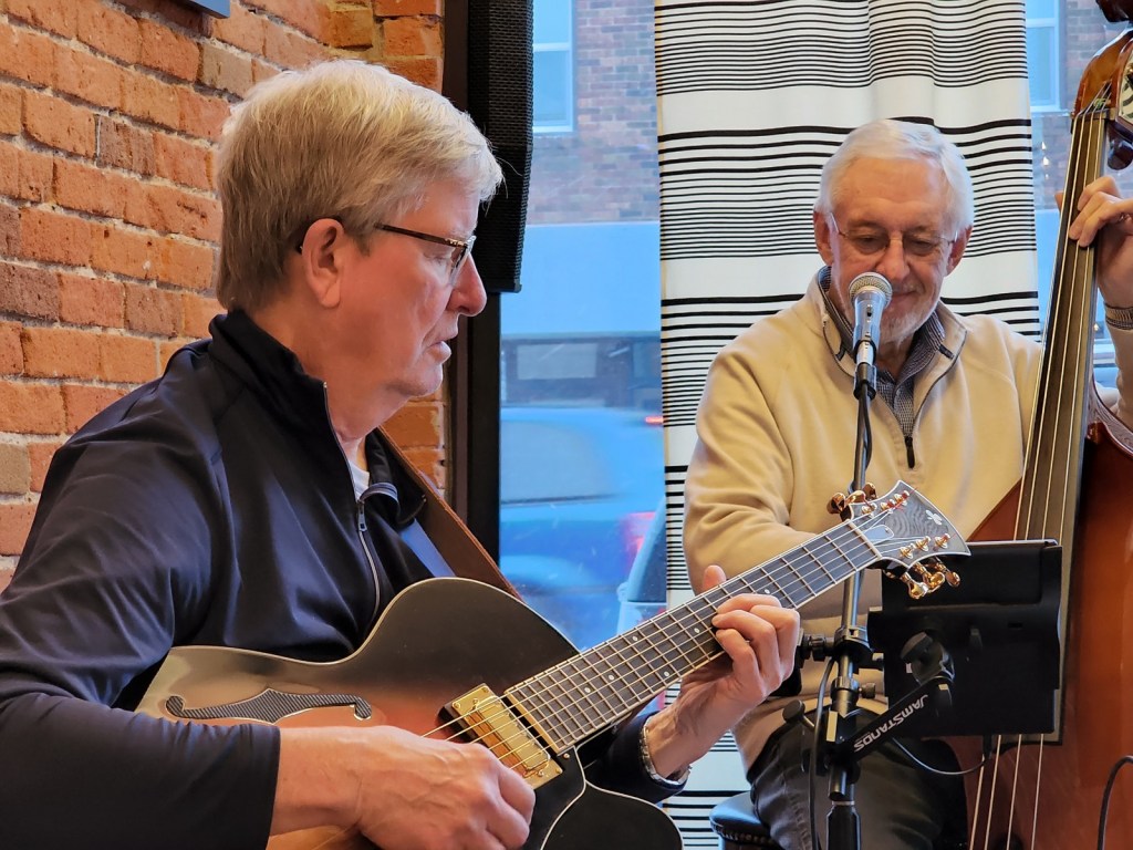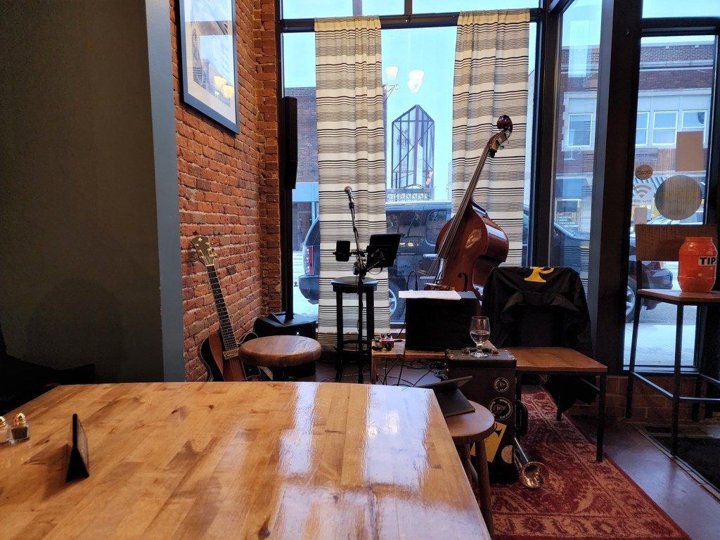 [Terry Kennedy – guitar; Jim Faber – bass & voice; Bill Riggs – trumpet; as a group, Tuesday Night Club. On this night, Al Lieffort – mandolin & voice, decided not to make his commute from Minneapolis because of the ongoing daily blizzard. The tip jar, in its luminescent orange color, adds to the overall ambience . . . ]