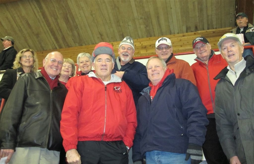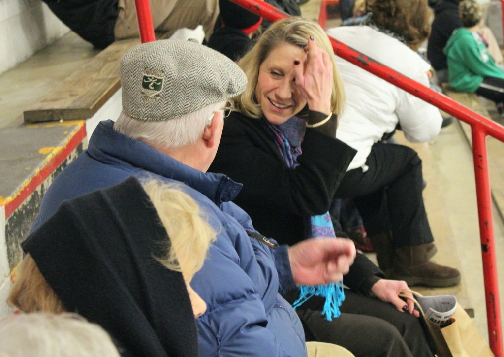 [And hockey moms always came for a visit. Here with Denise Drown, the family of the bison farm among other things, whose daughter Stephanie was a Cardinal goalie and daughter Melissa who once led the Cardinals in scoring and played club hockey at Minnesota . . . ]