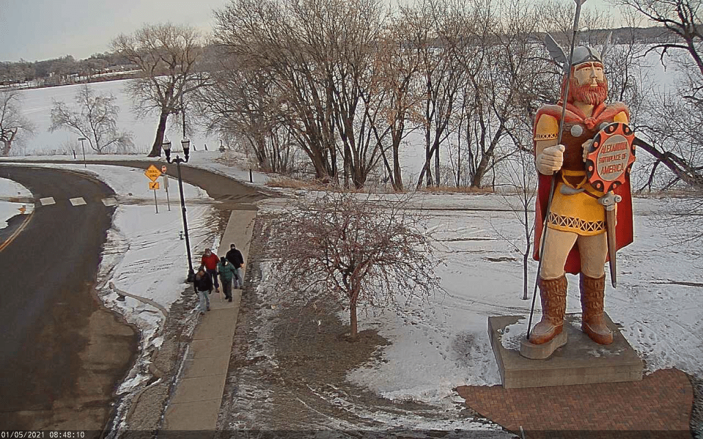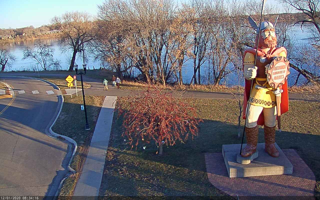 [Yes, Virginia, there is a Big Ole camera. My sister Gretchen in Washington, D.C., watches it regularly because she’s nosy. When she sees us walking she snaps the photo and sends it to me. Weakie is in the green puffy coat. It was December 1, but still no snow on the ground . . . ]