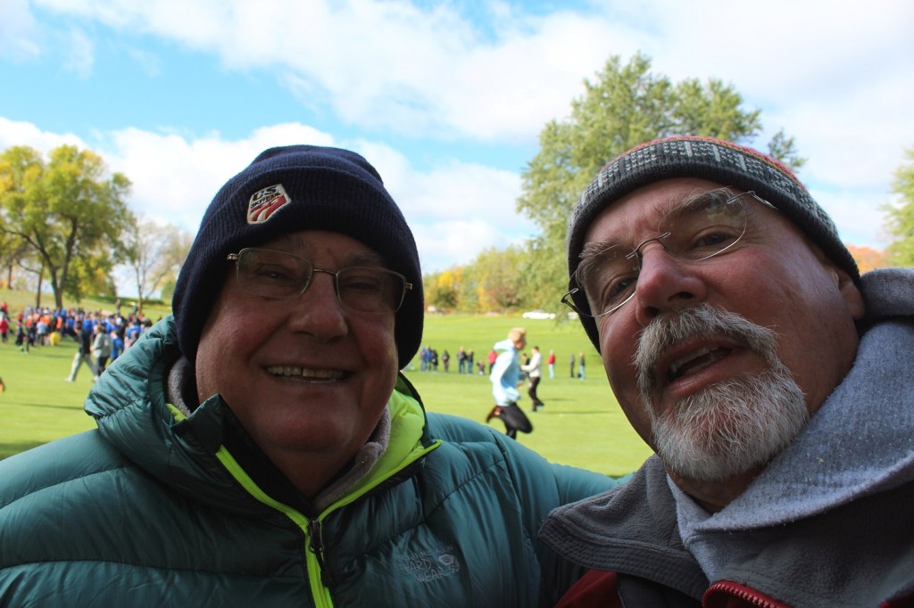 [There are fans, and then there are FANS! This was the annual Lions Club sponsored cross-country meet at Arrowwood in early October. Thousands of teams from all over the state participate. We were there for two reasons: Hasz and Hasz. The twin sisters, Megan and Bethany, from Alex were state champions for several years and several distances, and then went down to star for the Gophers where they have been Big 10 champions. As you can see from our attire, it was a beautiful day but I think the wind chill was around zero . . . ]