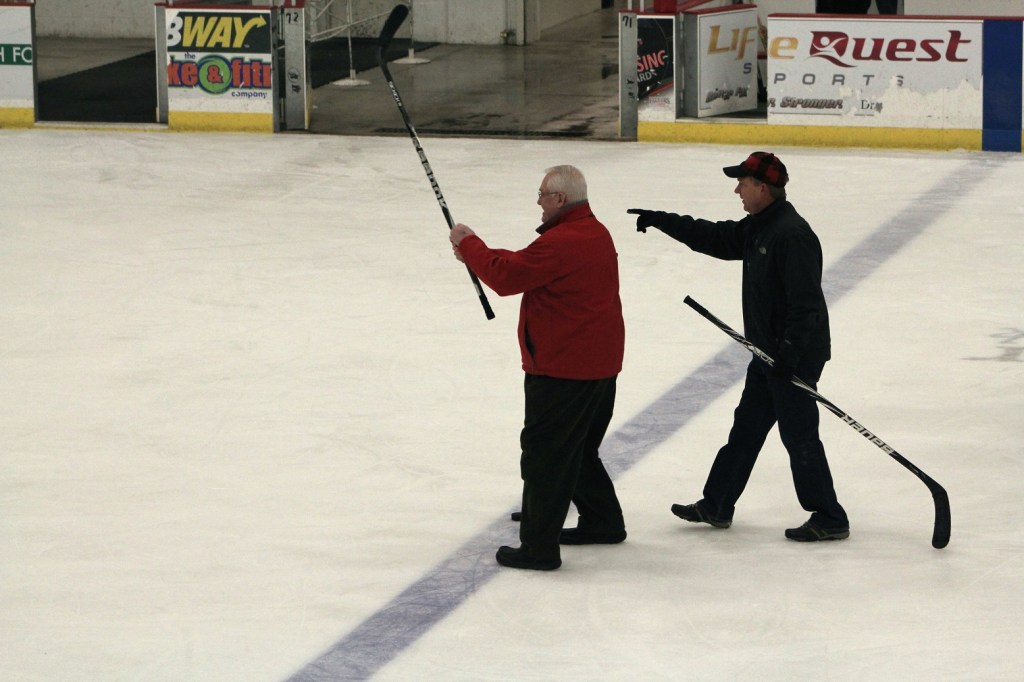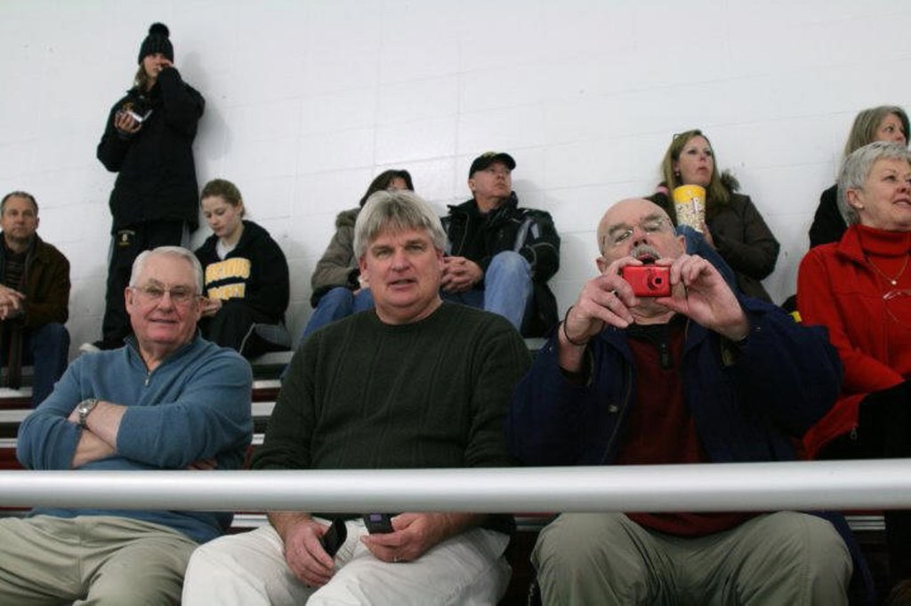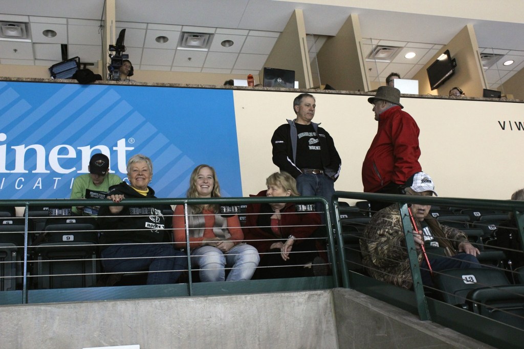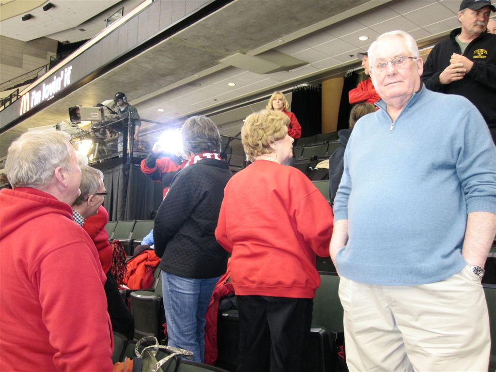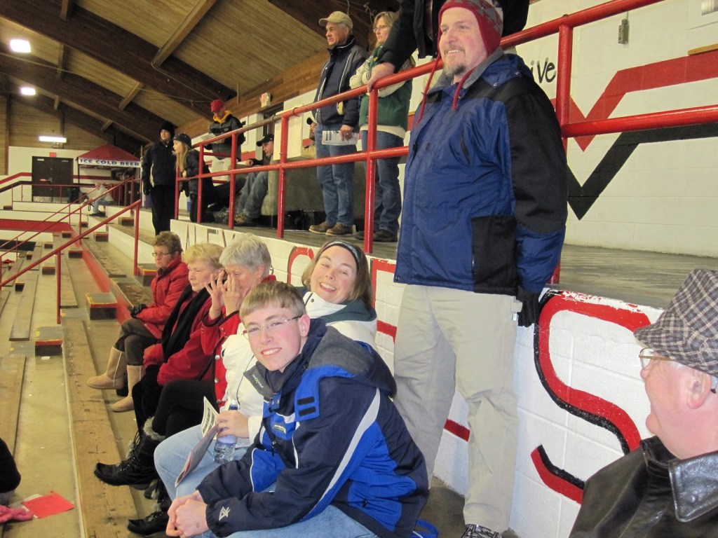 [Holding fort at a hockey game, joined by Ken “The Crane” and Jeanne Howell. Ken is a way too thin Fat Boy . . . ]