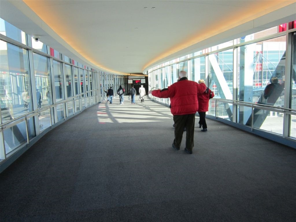 [Walking the skywalk from the parking garage to the XCel Center for a game . . . ]