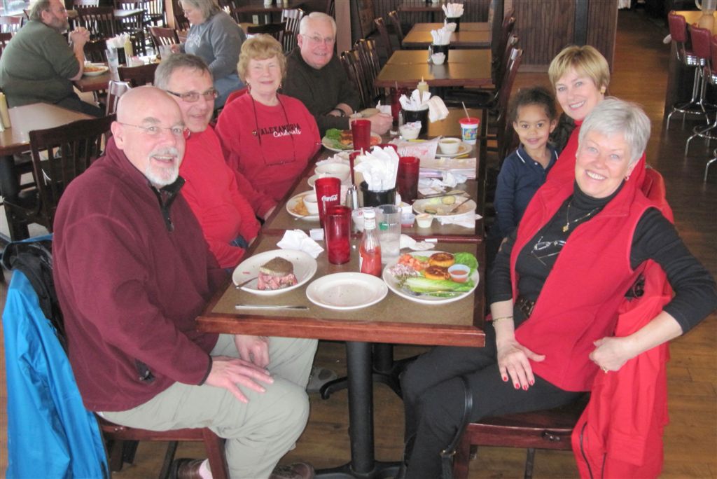 [A pre-game nosh at Mort’s Deli in Minnetonka. To make us feel even older, my high school classmate Kathy Skadsberg (next to Ruthie) has a granddaughter with her. Said granddaughter, Taylor Woodson, will be a senior at Hopkins High School next year, has started for their multiple state champion basketball teams since she was a freshman, and has committed to play for Michigan . . . ]