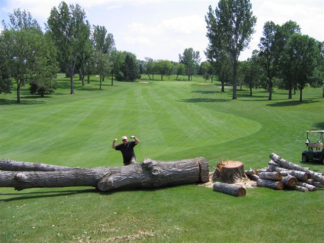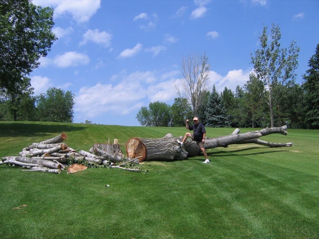 [Recently unearthed,Weakie proudly and happily standing over the dispatched tree on hole No. 16, the bane to anyone who went to the right off the tee! (Date, June 16, 2007)]