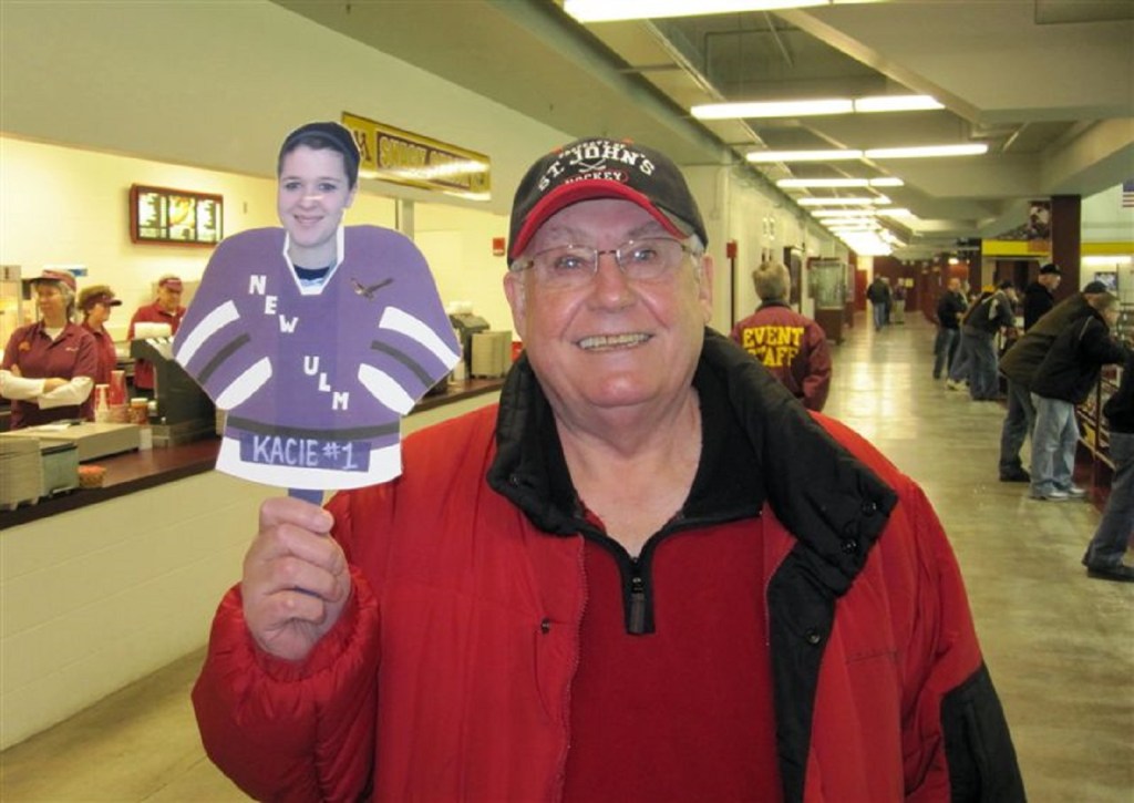 [Once a New Ulmer, always a New Ulmer. At Ridder Arena on the U of M campus where the state tournament consolation games are played. New Ulm and Alex, usually, as small outstate schools end up here after losing to the dreaded Big City private schools in the first round. Another area where the Weakster & I were in total agreement was a shared animus toward private schools . . . ]