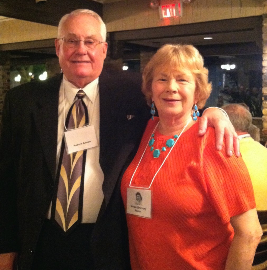 [At Vivian’s 55th class reunion, Roosevelt High, Mpls. Weakie sat with one of her classmates, Greg Larson, who played football for the Gophers and the New York Giants as an interior lineman at 6’3″, 250 pounds . . . ]