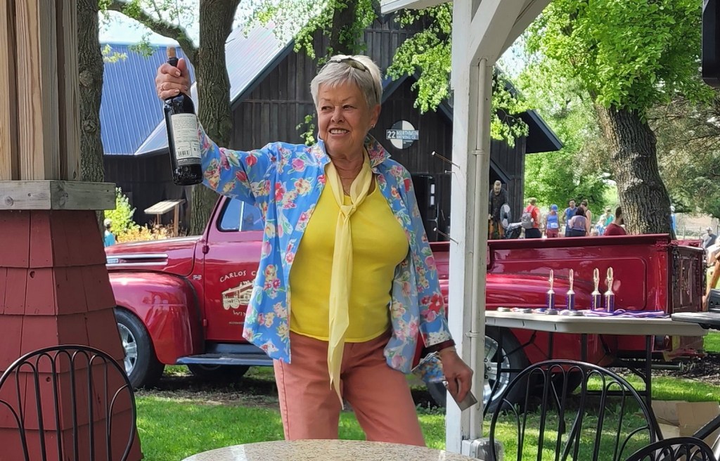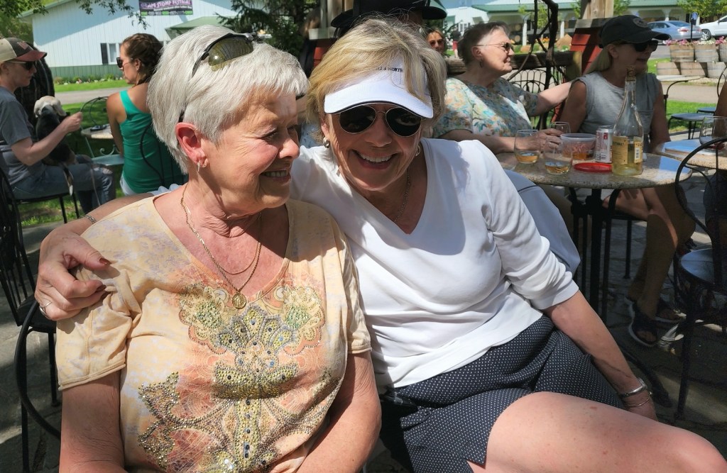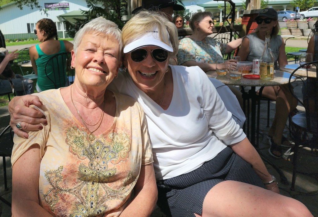[Karin and Ruthie wend their way back through the crowd with their bottles of Carlos Creek Marquette . . . ]