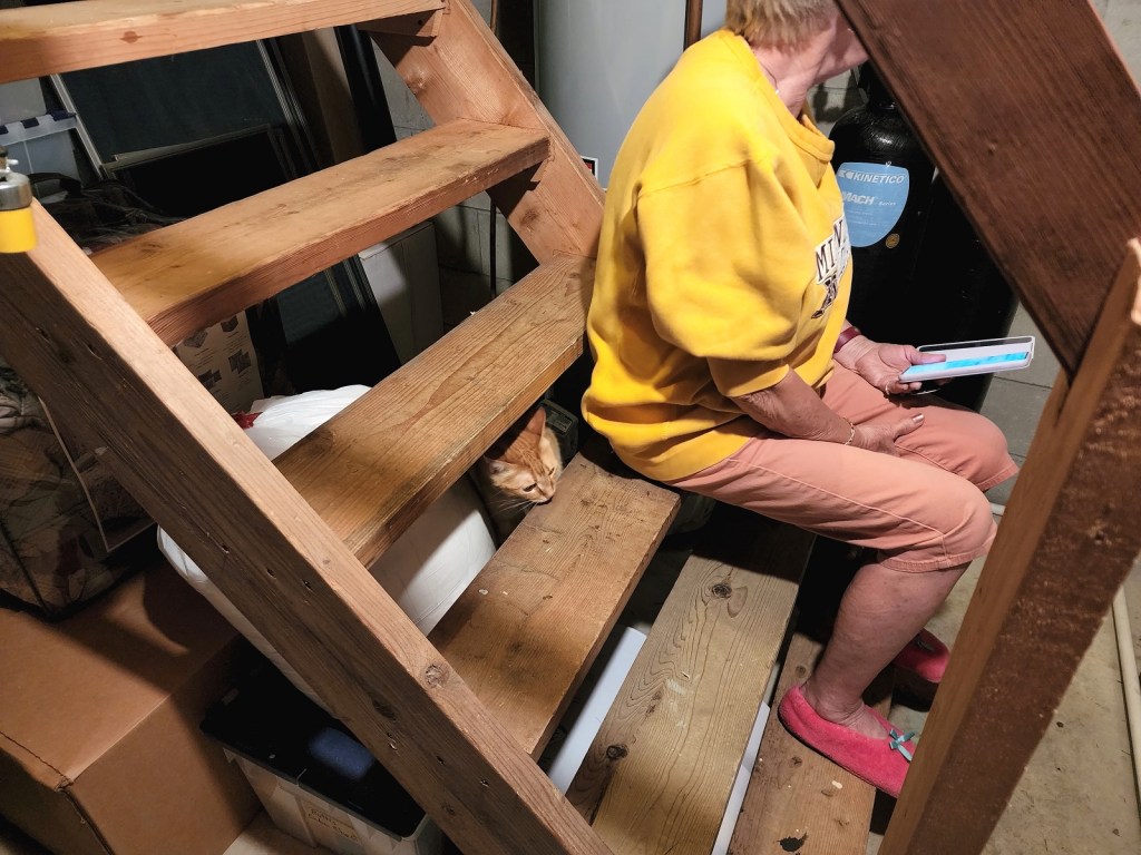 [We had to go to our tornado shelter again. Raced around the house trying to catch the kitties. We spent about 45 minutes here, listening to Tommy Lee on KXRA describe what was going on outside. This is where we heard the tornado had hit Forada, about 12 miles south of Alex . . . ]