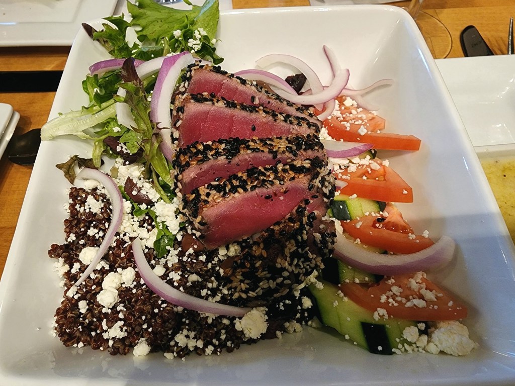 [Tuesday Night Club was actually performing on Tuesday night. At the Garden Bar, where I hummed along while noshing on a Greek bowl with ahi tuna . . . ]