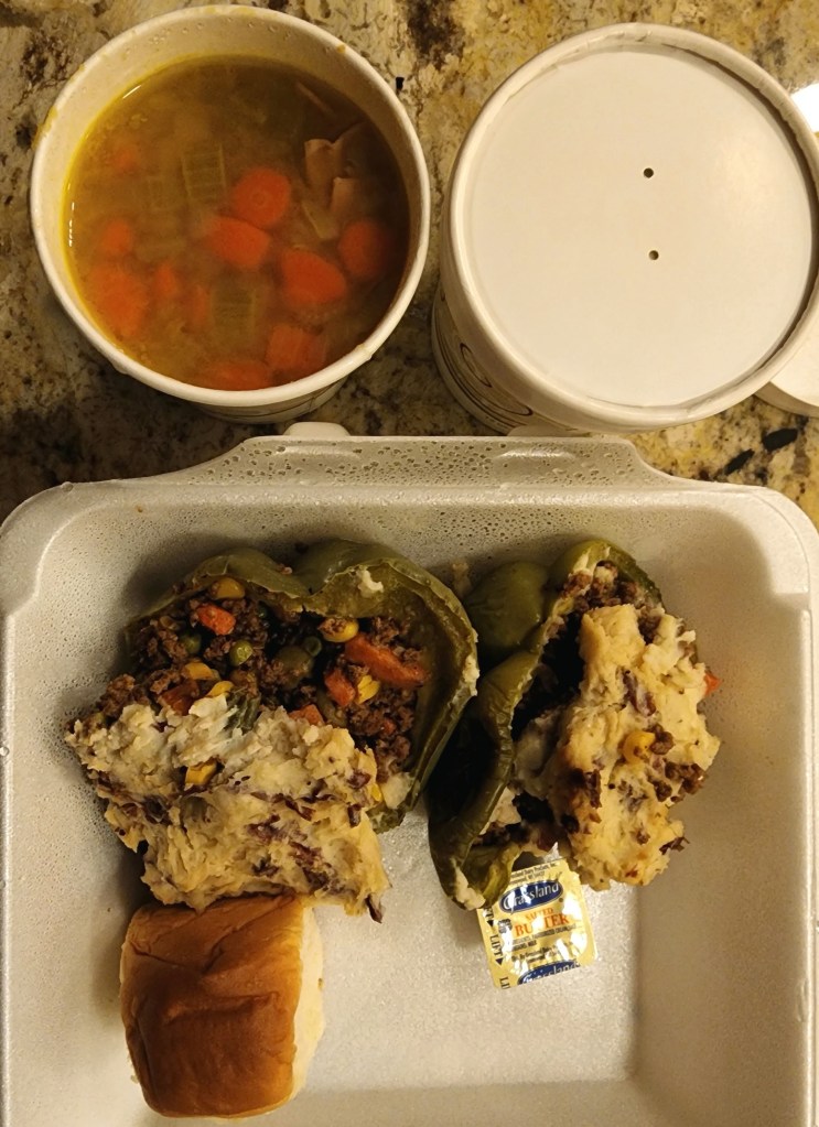 [The Super brought home most of her shepherd’s pie stuffed green peppers, it was just too much. My split pea with ham soup was so good I got two take out orders as well. Our two meals that night produced four meals the next day as we had my soup for lunch and her stuffed peppers for dinner . . . ]