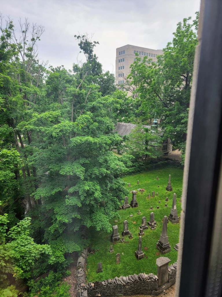 [It’s a privately owned cemetary located on campus, the creek on the left was the River Jordan. Jordan was IU’s first president. However, Jordan was a eugenicist – the name of the creek was recently changed to the Campus River . . . ]