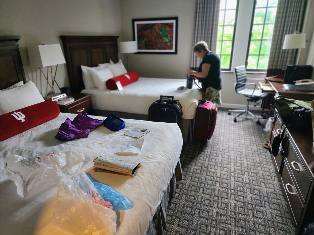 [We’ve completed our trip and are settling into our room in The Biddle Hotel and Conference Center, located in the Indiana Memorial Union where our classes were. How convenient!]