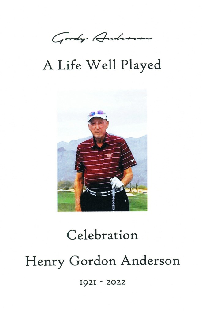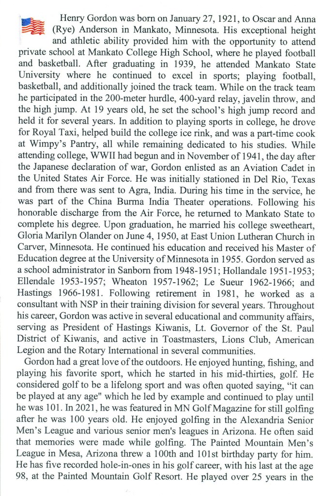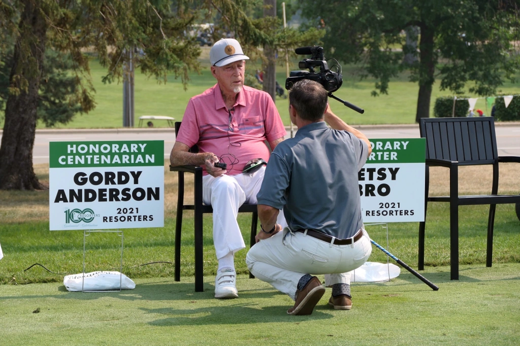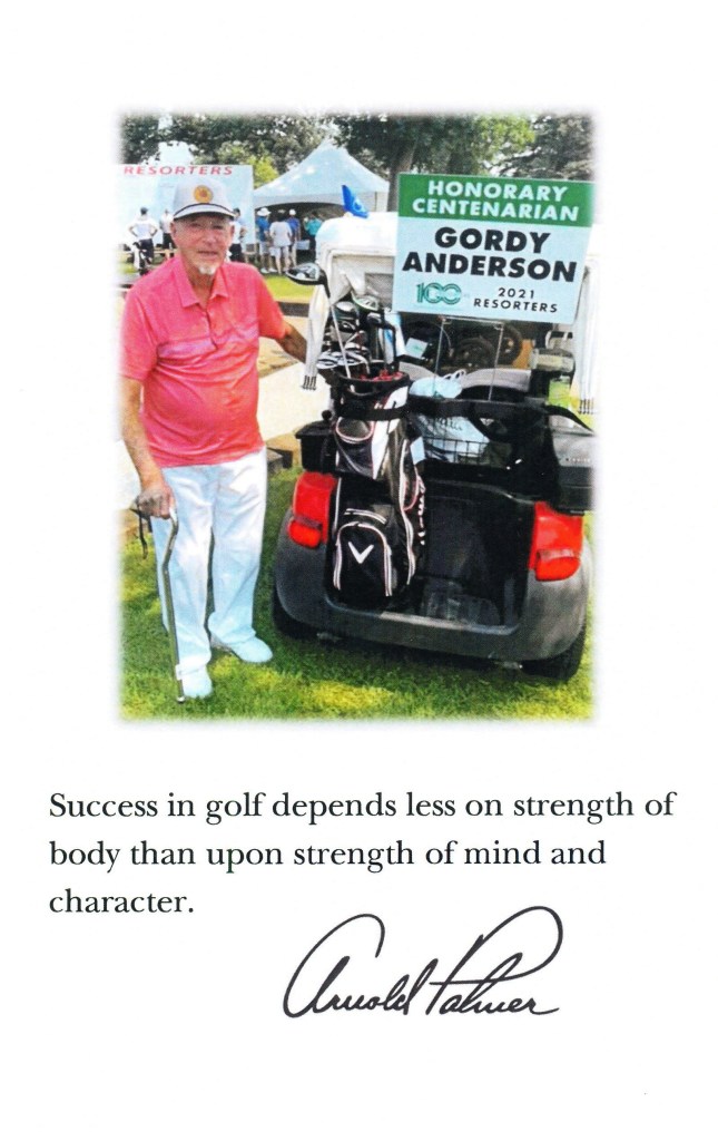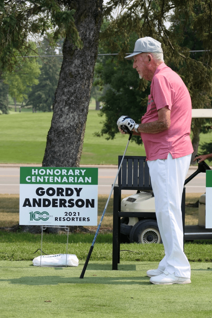 [Gordy Anderson, at age 100, teed off in the 100th Resorters Golf Tournament at the Alexandria Golf Club on August 3, 2021. Gordy received some national notoriety for this event . . . ]