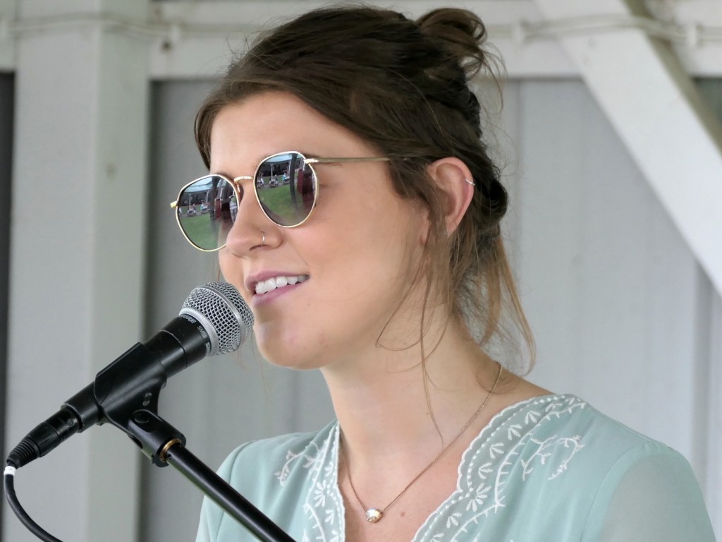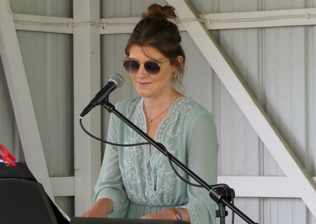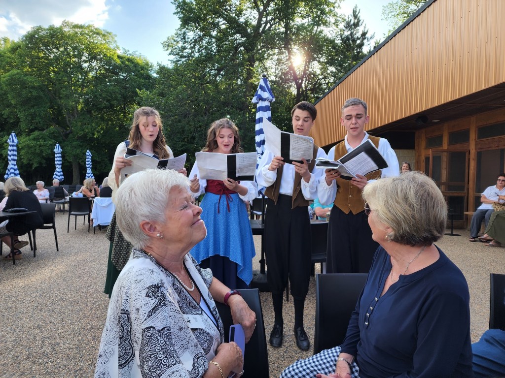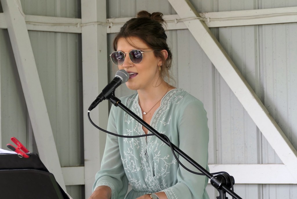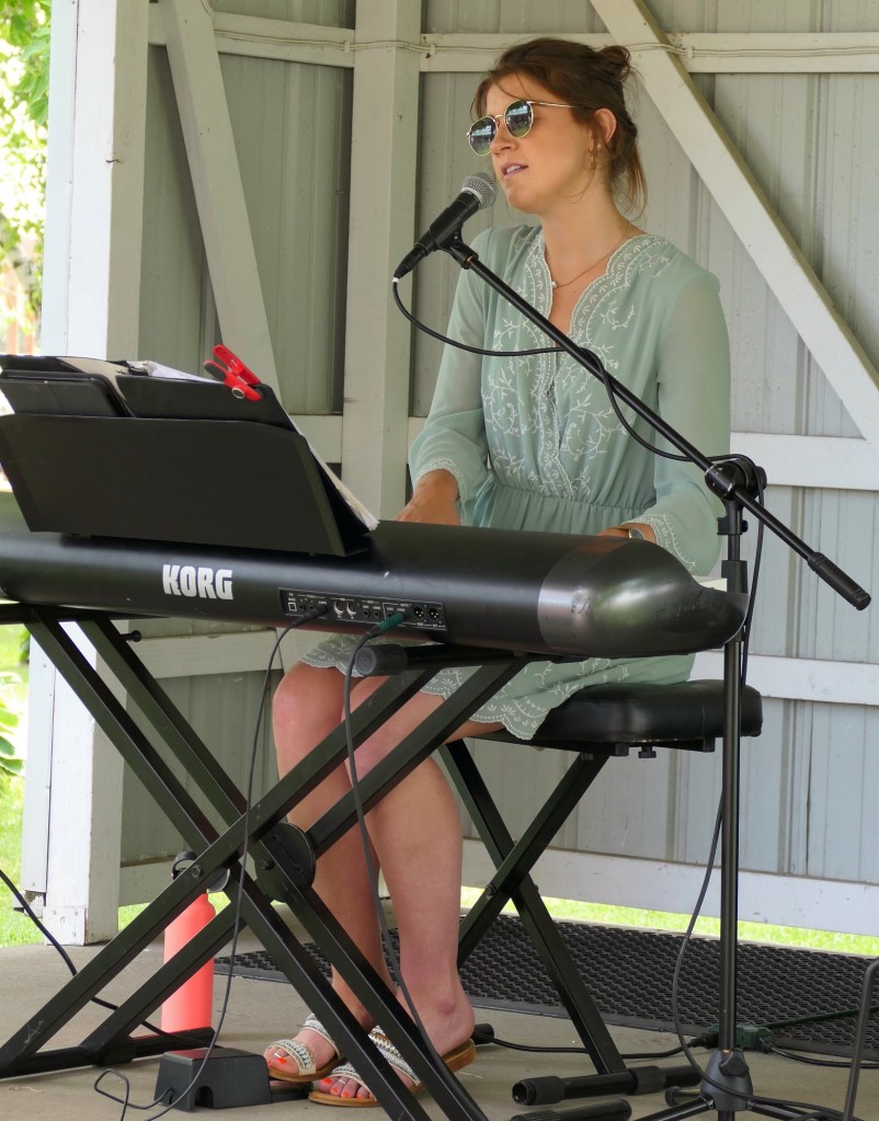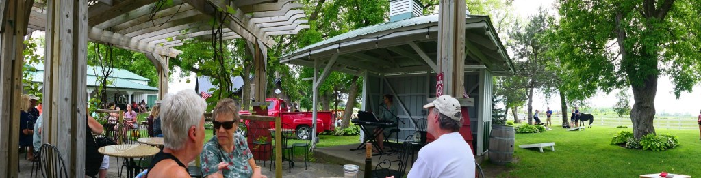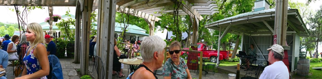 [It’s nice to be serenaded while sipping wine on the patio prior to the show . . . ]