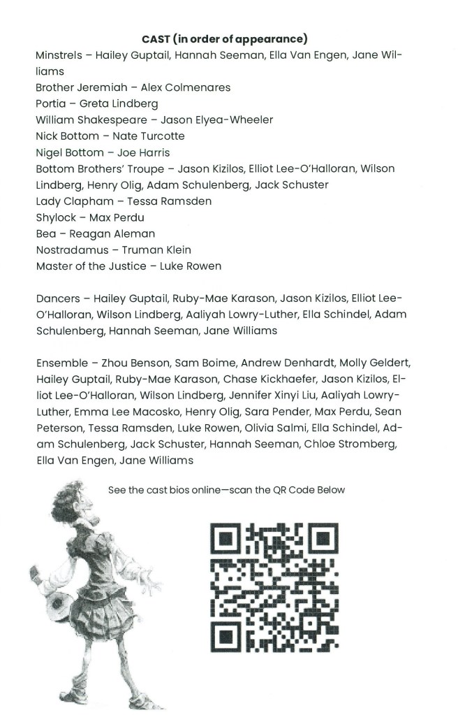 Adam Schulenberg (Bottom Brothers’ Troupe, Dancer, Ensemble) – Adam has been doing theatre since 4th grade, so it definitely made its mark on his childhood. Next year he will be heading off to the University of Oregon to study Cinema. Adam would like to thank the many people he met along the way for creating an experience he’ll never forget.