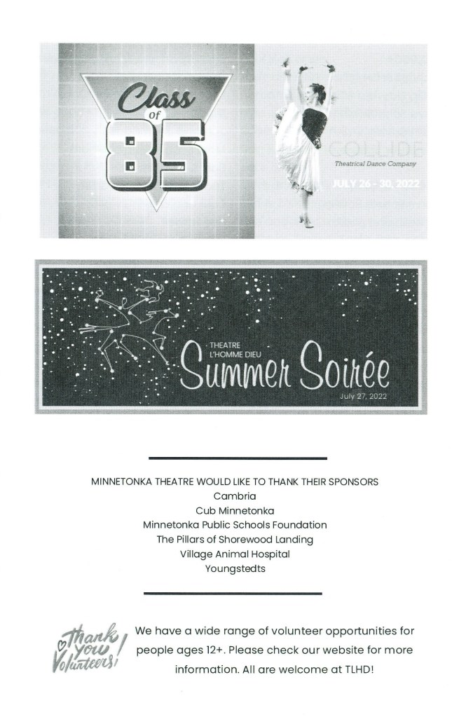 Jenna DeJong (Sound Board Operator) – Jenna will be a sophomore at the University of Wisconsin Eau Claire this fall. She is on the Pre-Med track with ambitions to become a doctor. Some of Jenna’s fondest memories involve her time at Minnetonka Theatre, especially her stay in Alexandria for Bright Star in 2019, her time behind the sound board, and most importantly the friends she made in the theatre. A special thanks to her mentors Nathan Humason, Jeff Geisler, and Matthew Kudas for helping her even when she asked stupid questions. This will be Jenna’s 19th show with Minnetonka. She is excited to be back at Theatre L’Homme Dieu rejoining her Minnetonka Theatre family one more time.