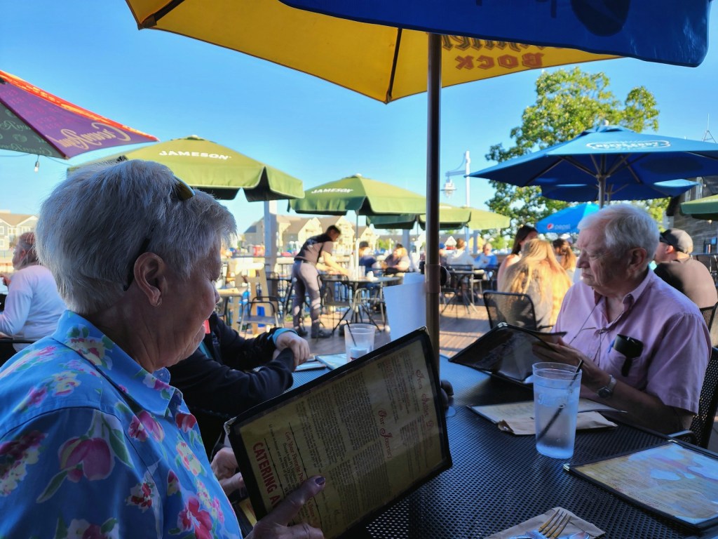 [Fine dining at Parker John’s BBQ & Pizza on the Sheboygan waterfront. Since one needs a scorecard to know the players, across from Ruthie is Ed Hatch, father of Chris, who is married to Ruthie’s sister Rita’s daughter Beth. You’ll be quizzed on this later in the semester . . . ]