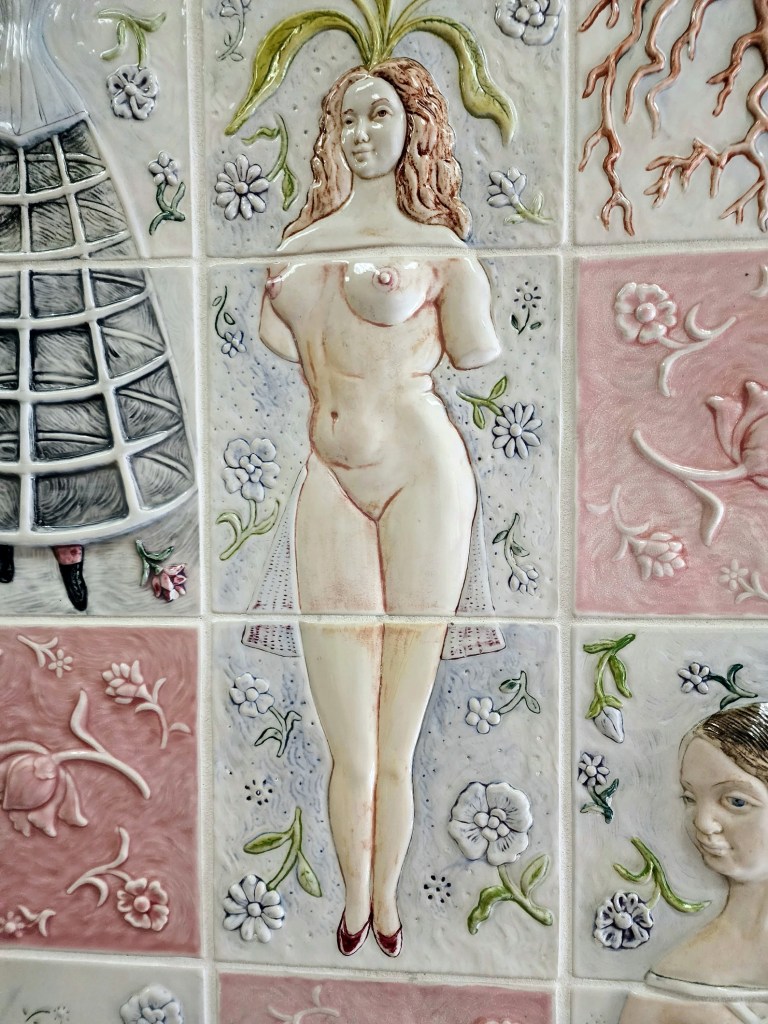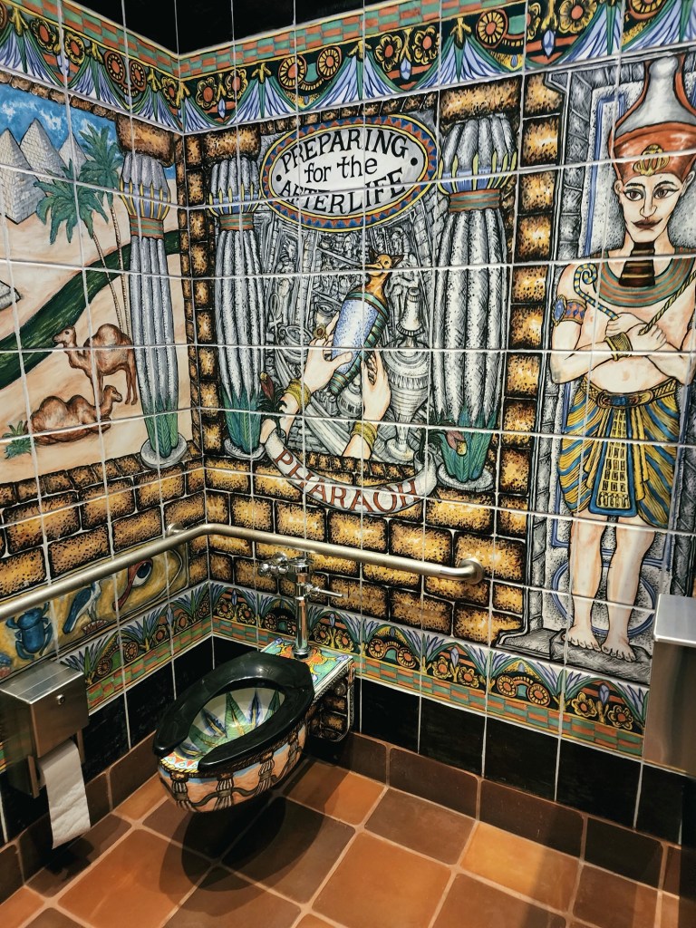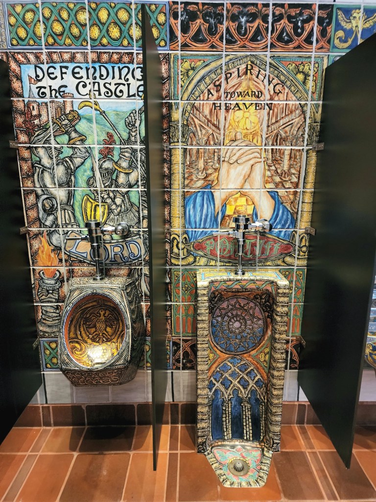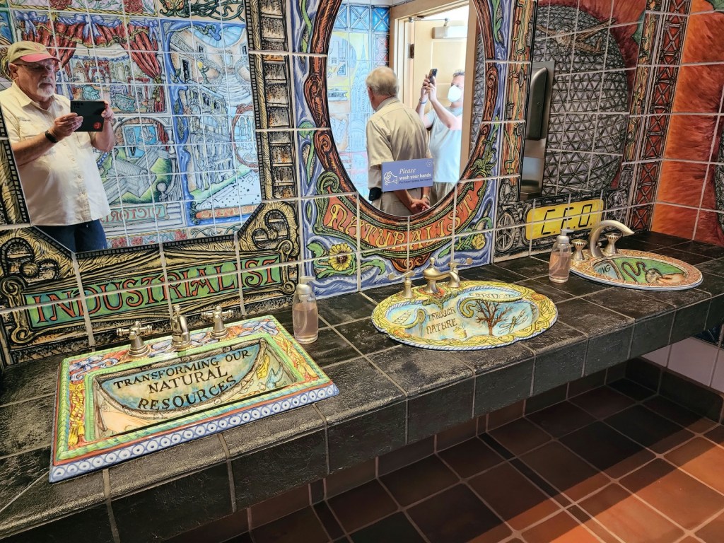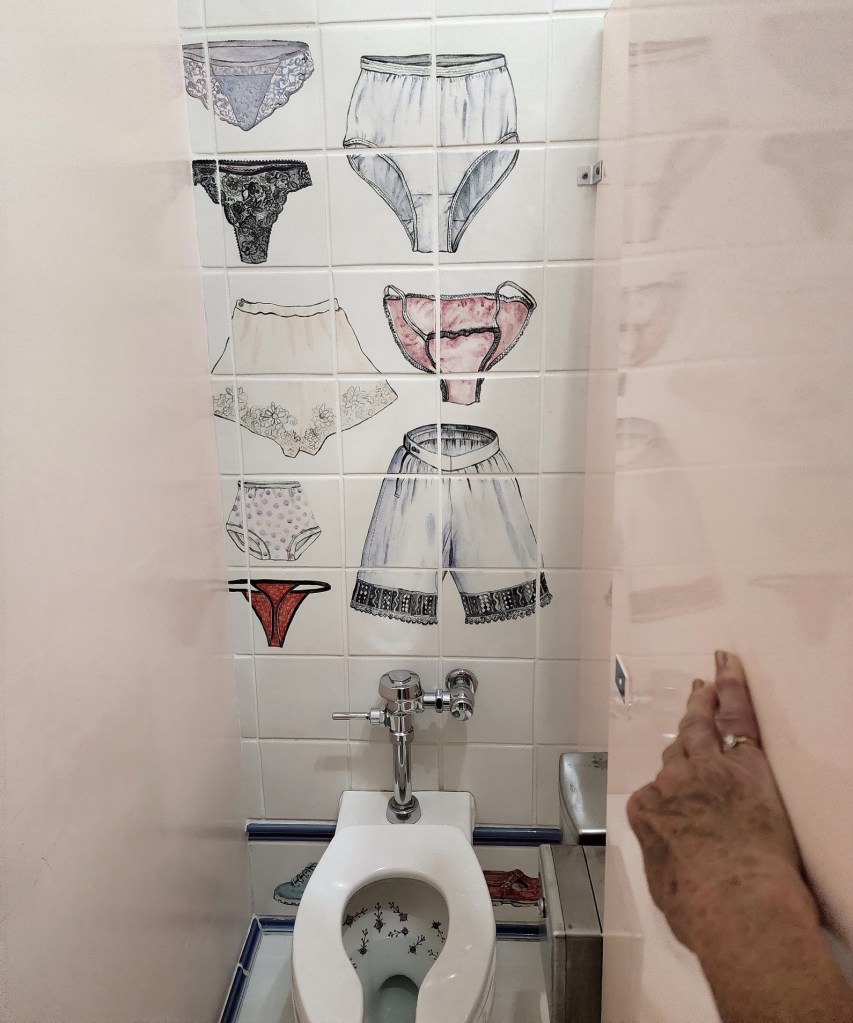 [Beth, Elke (Ed’s wife), and Rita, like all the ladies every year, enjoy a trip to the men’s room. When you first come in the Arts Center you must first visit the two restrooms, which are signature works of art in among themselves . . . ]