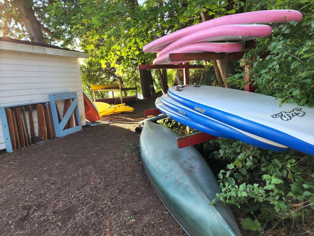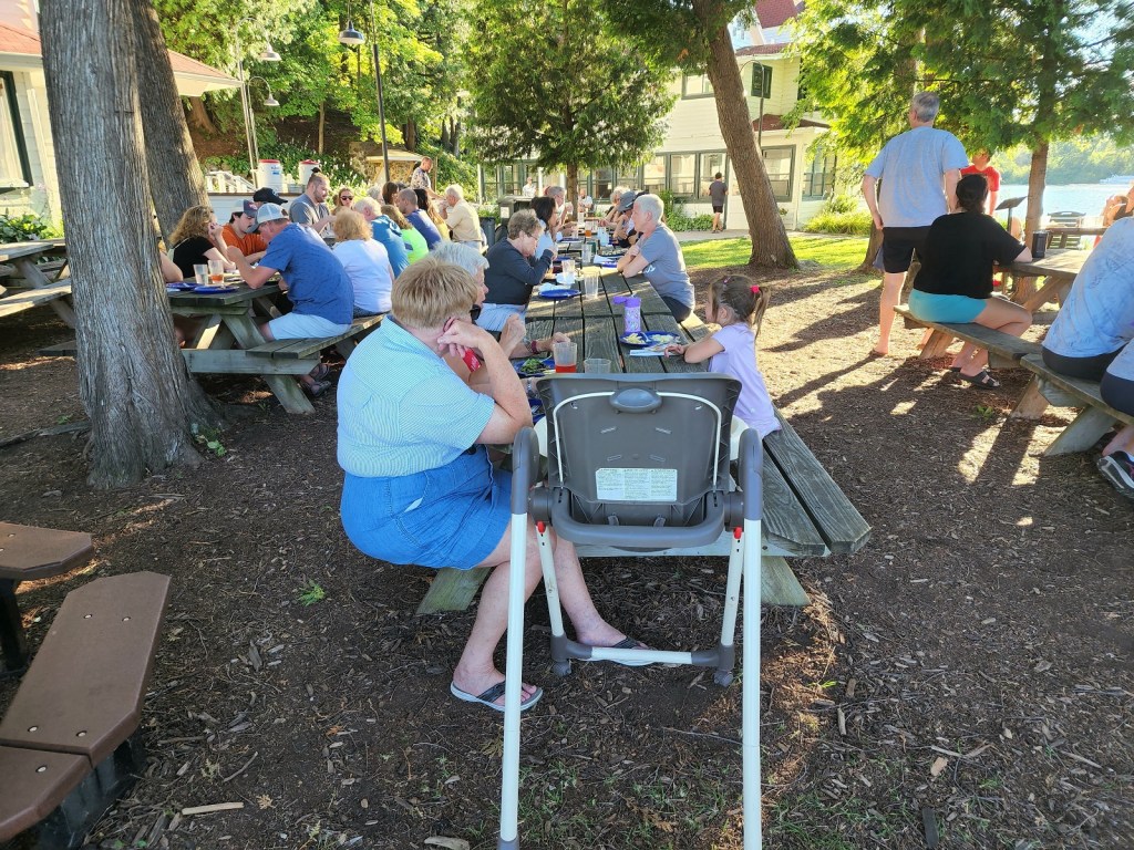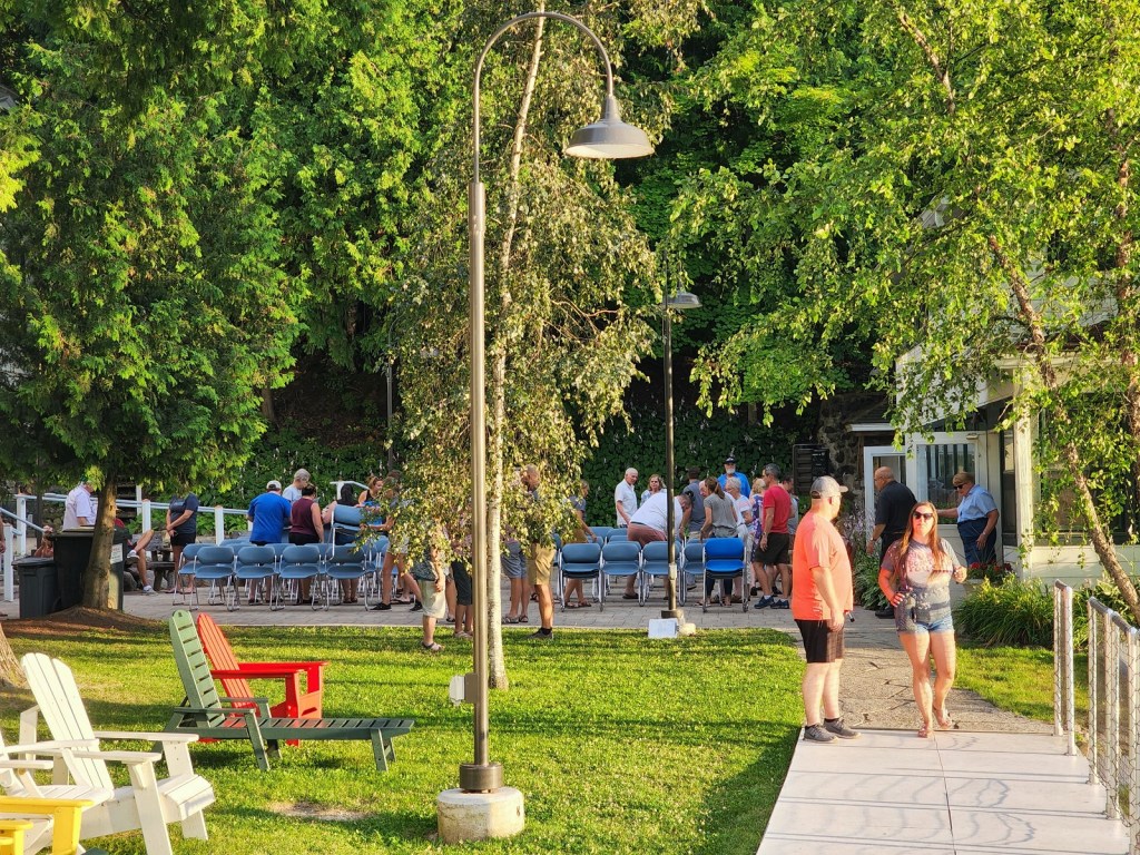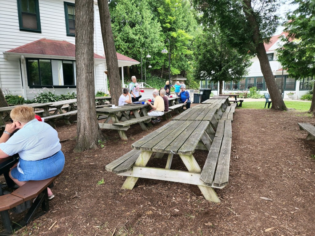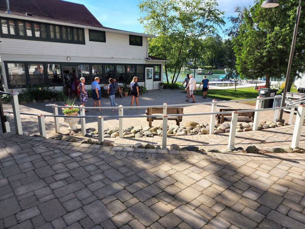 [Looking back from the dock at the patio which was set up for new camper introductions . . . ]