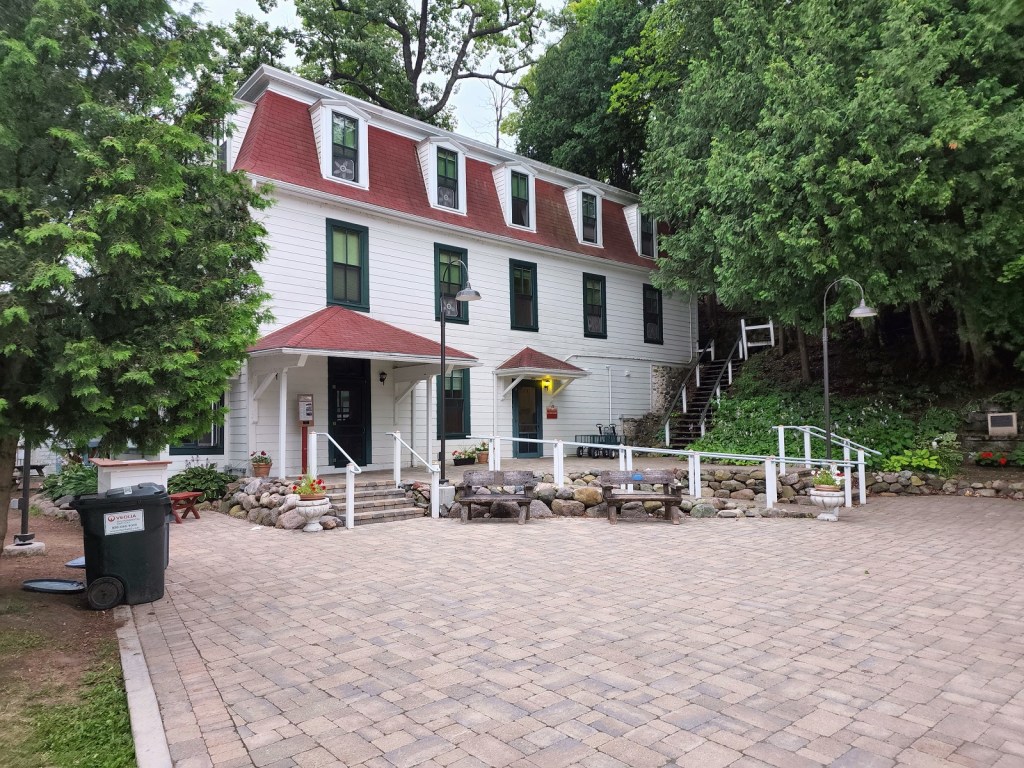 [The inn, across the patio from the mess hall, with a game room, showers, and rooms for campers on the 2nd and 3rd floors . . . ]