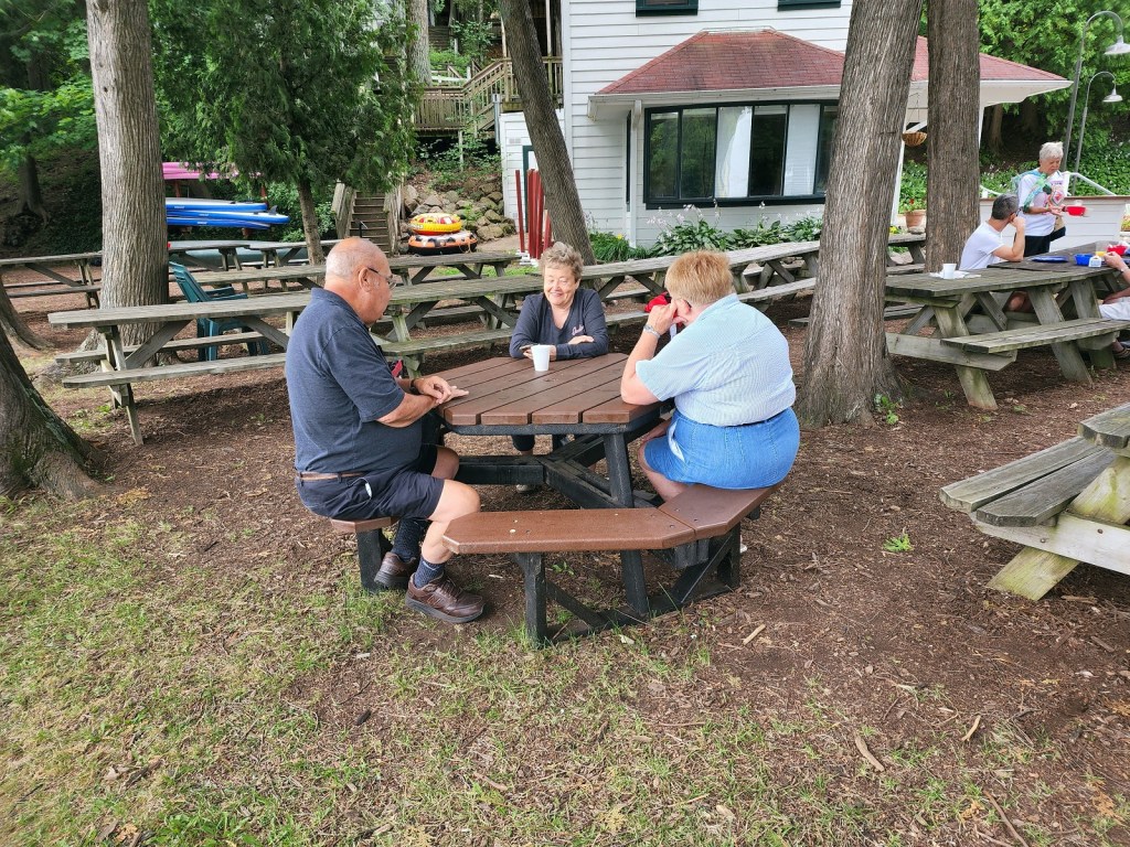 [After breakfast discussions with old friends we may not have seen for three years. Here are Scott and Vicki from Ft. Wayne (campers for over 40 years) with Rita (camper for almost 40 years) in the middle . . . ]