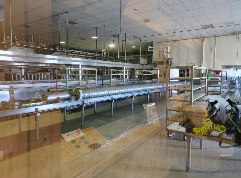 [Years ago Henning’s offered full tours of the factory, but no longer. Here through the class are many large cheese presses all in a row . . . ]