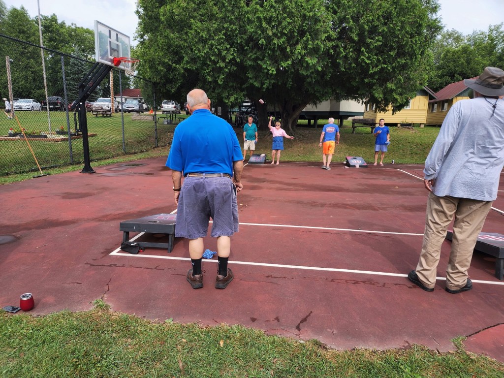 [Let the games begin! Here the cornhole tournament with the aforementioned Fort Waynians Scott (throwing) & Vicki teaming up . . . ]