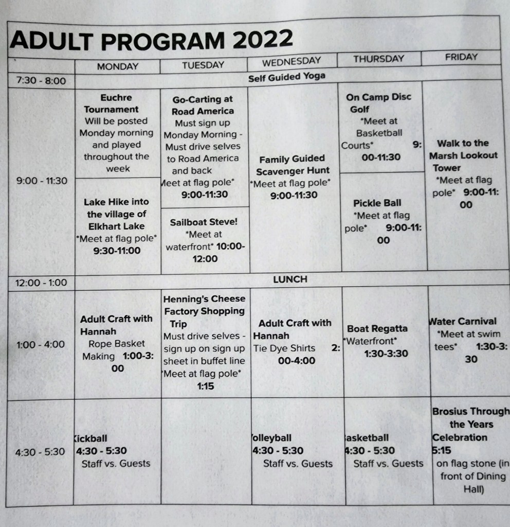 JUST THE FACTS, MA’AM! We arrived home from Camp Brosius in Elkhart Lake, Wisconsin, in just a tidge over 7 hours with one stop for gas and a state mandated stop at the DQ in Albany, MN. The one-way distance was 452 miles. Our total mileage for the one week stay was 1014 miles. DYK that gas in eastern Wisconsin was a mere $3.39 per gallon? ~ Me