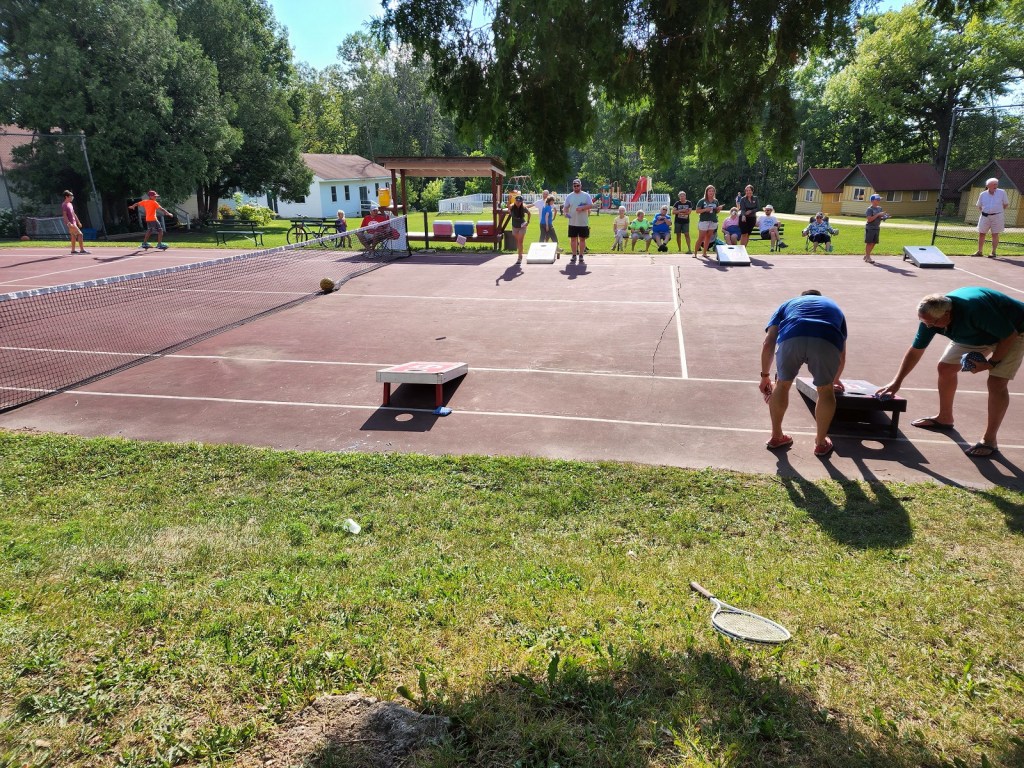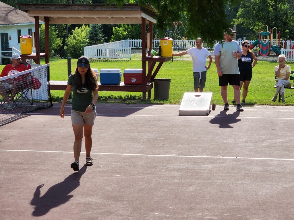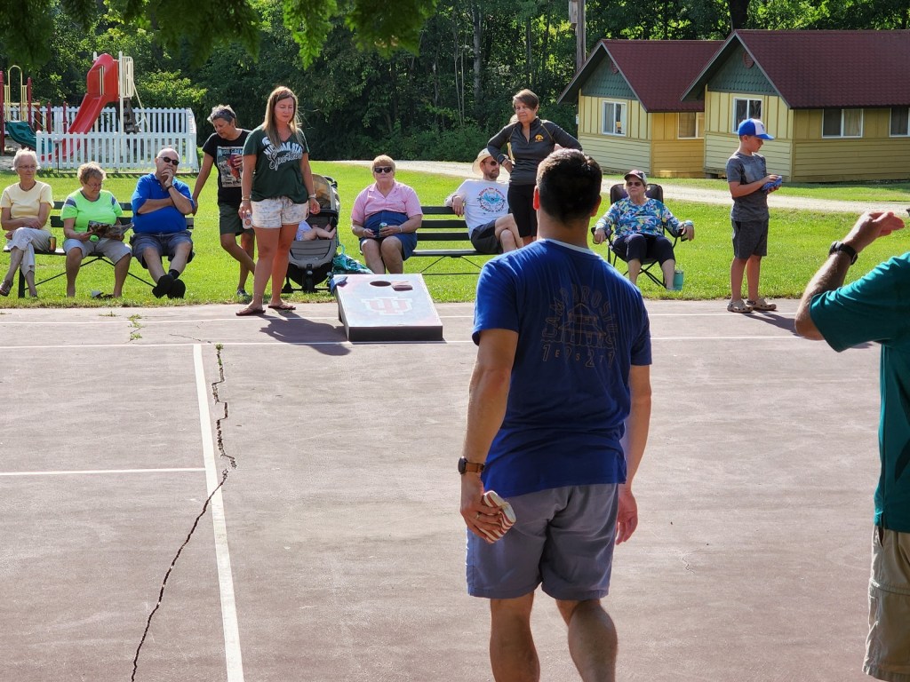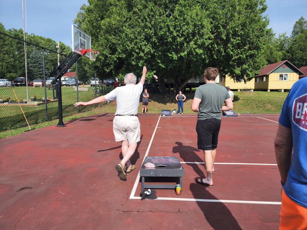 [Jenny (throwing) and Kent (blue shirt), daughter-in-law and son of Vicki and Scott, defending their cornhole championship once again. They are a mini-dynasty . . . ]