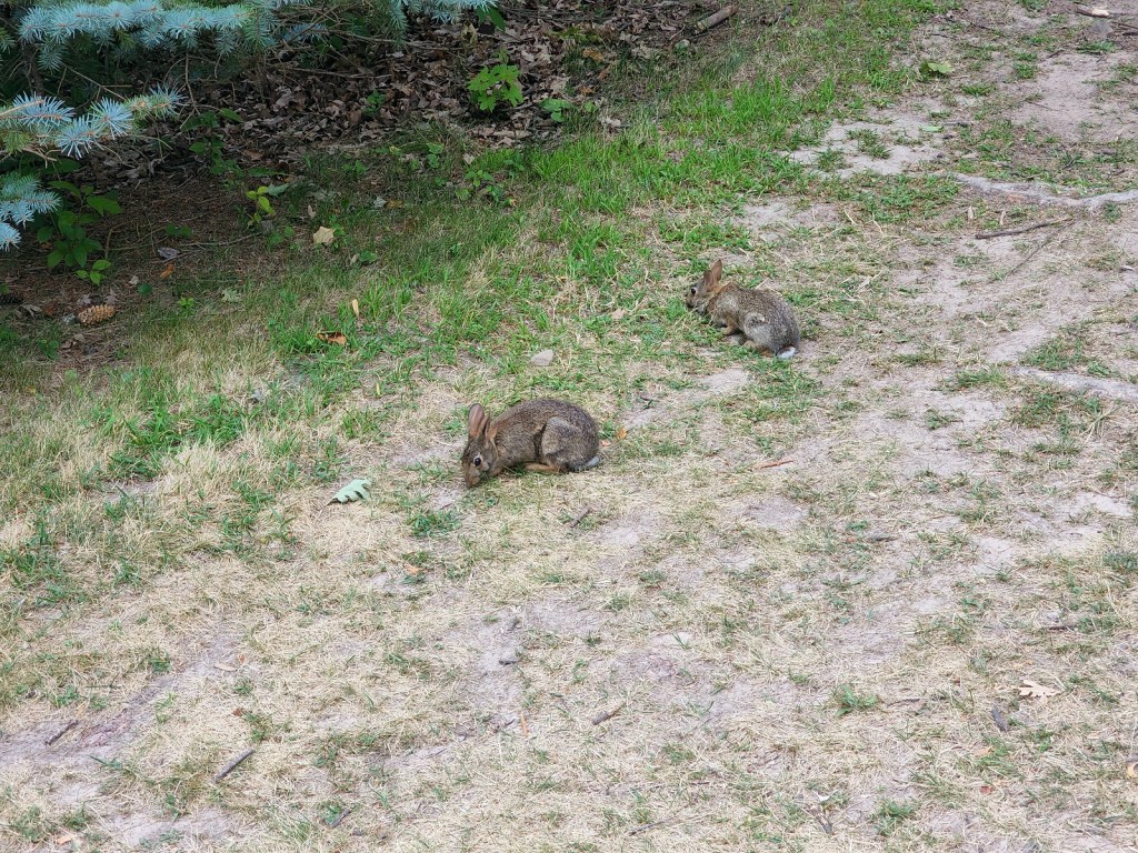 [These guys/gals must live under the evergreen in our front yard. So accustomed to campers, they are hardly distracted when we walk by . . . ]