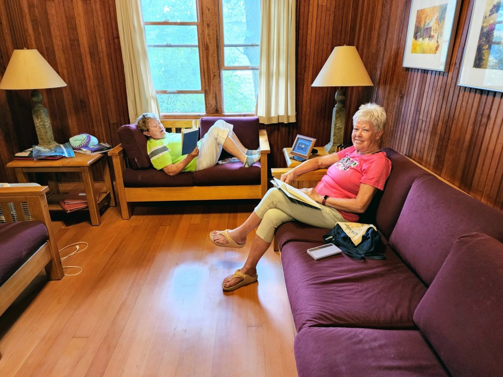 [With the staff driver, Chris, Elke, Beth, Jack, and Phyllis. Jack and Phyllis, both geology professors at Austin Peay University, had no previous connection to Indiana University until about 12 years ago (I think they said at introductions) when they saw an ad for Camp Brosius. They thought it looked like a nice place for a week’s summer vacation and have been coming every year since. We watched their daughter grow up in camp and now she’s in college, doing a summer work program and living in Arlington, Virginia, less than a mile from where Ruthie and I lived . . . ]