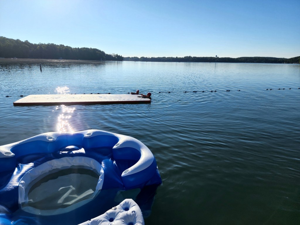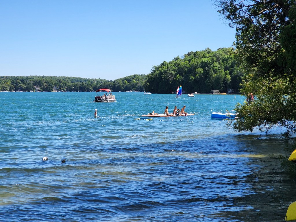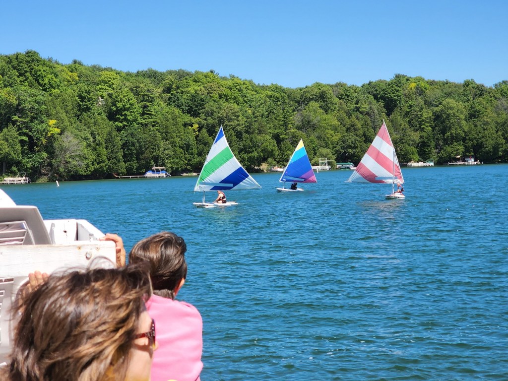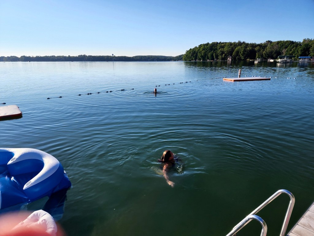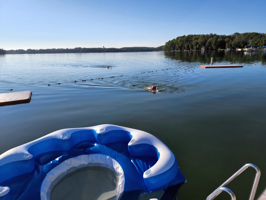 [The activities for the last full day of camp begin with the lake swim. The pontoon takes all the competitors across the lake for the one-mile swim back to camp – it was a shorter 2/3 of a mile this year . . . ]