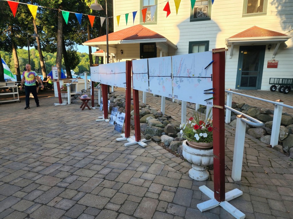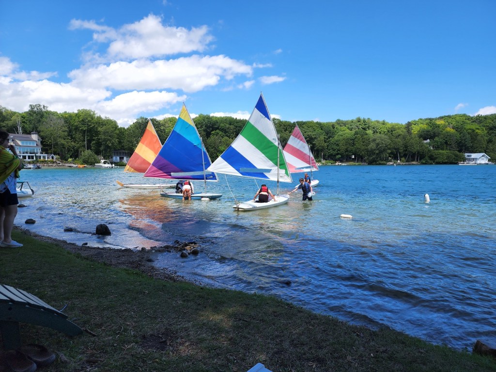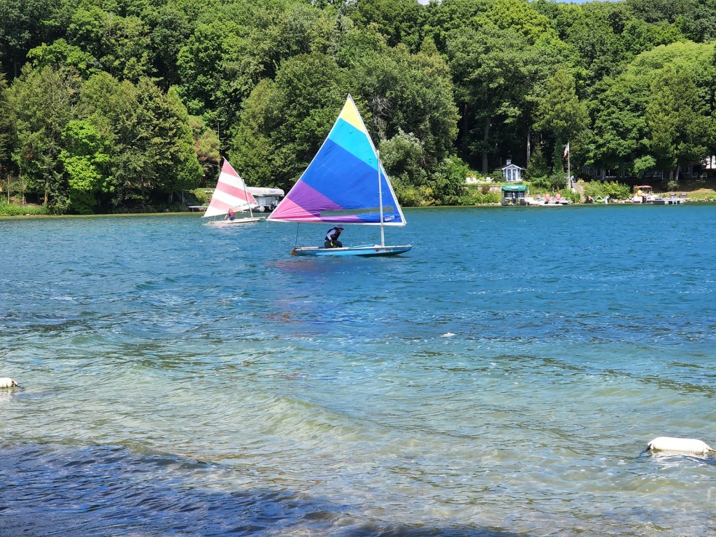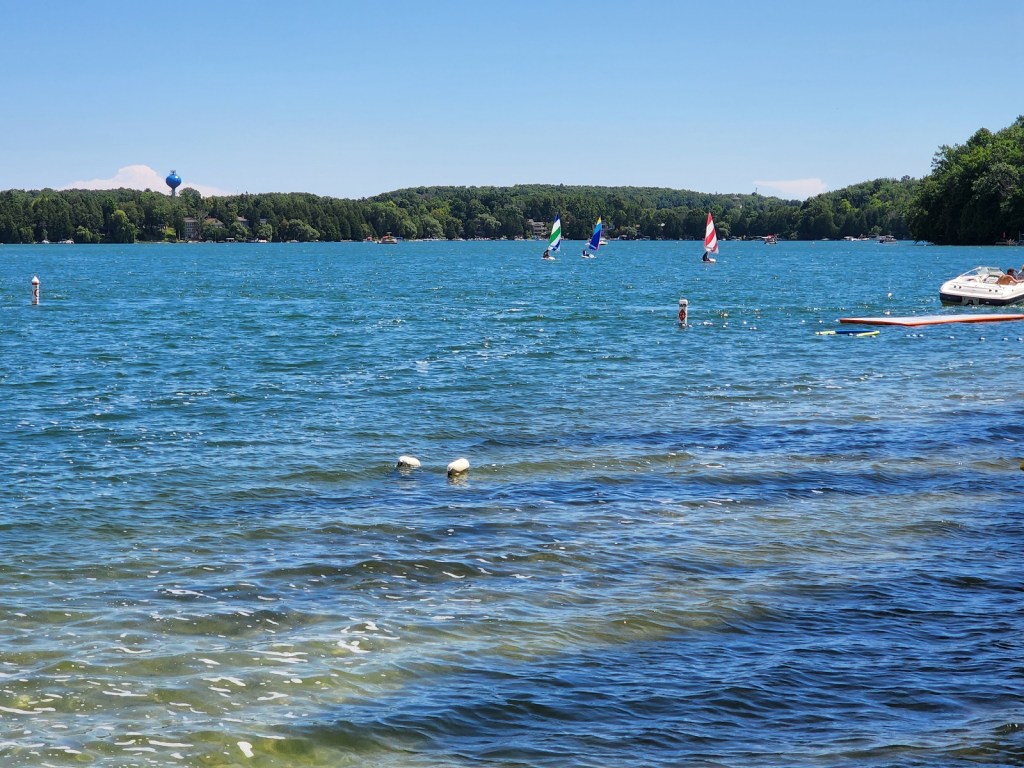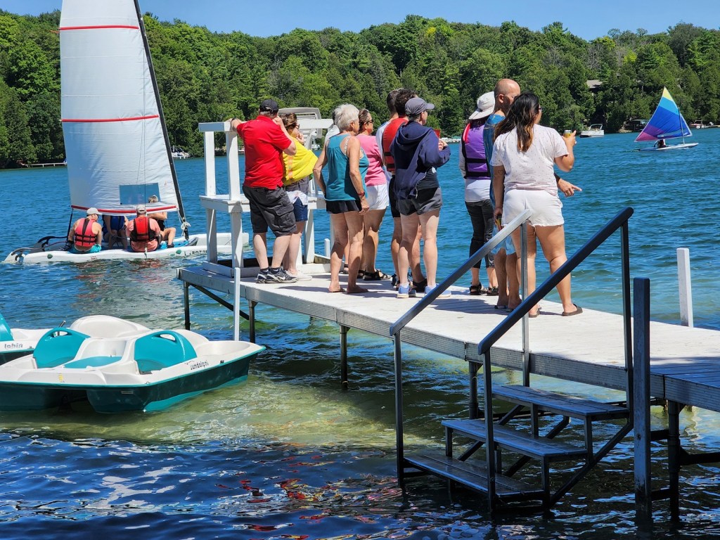 [The activities for the last full day of camp begin with the lake swim. The pontoon takes all the competitors across the lake for the one-mile swim back to camp – it was a shorter 2/3 of a mile this year . . . ]